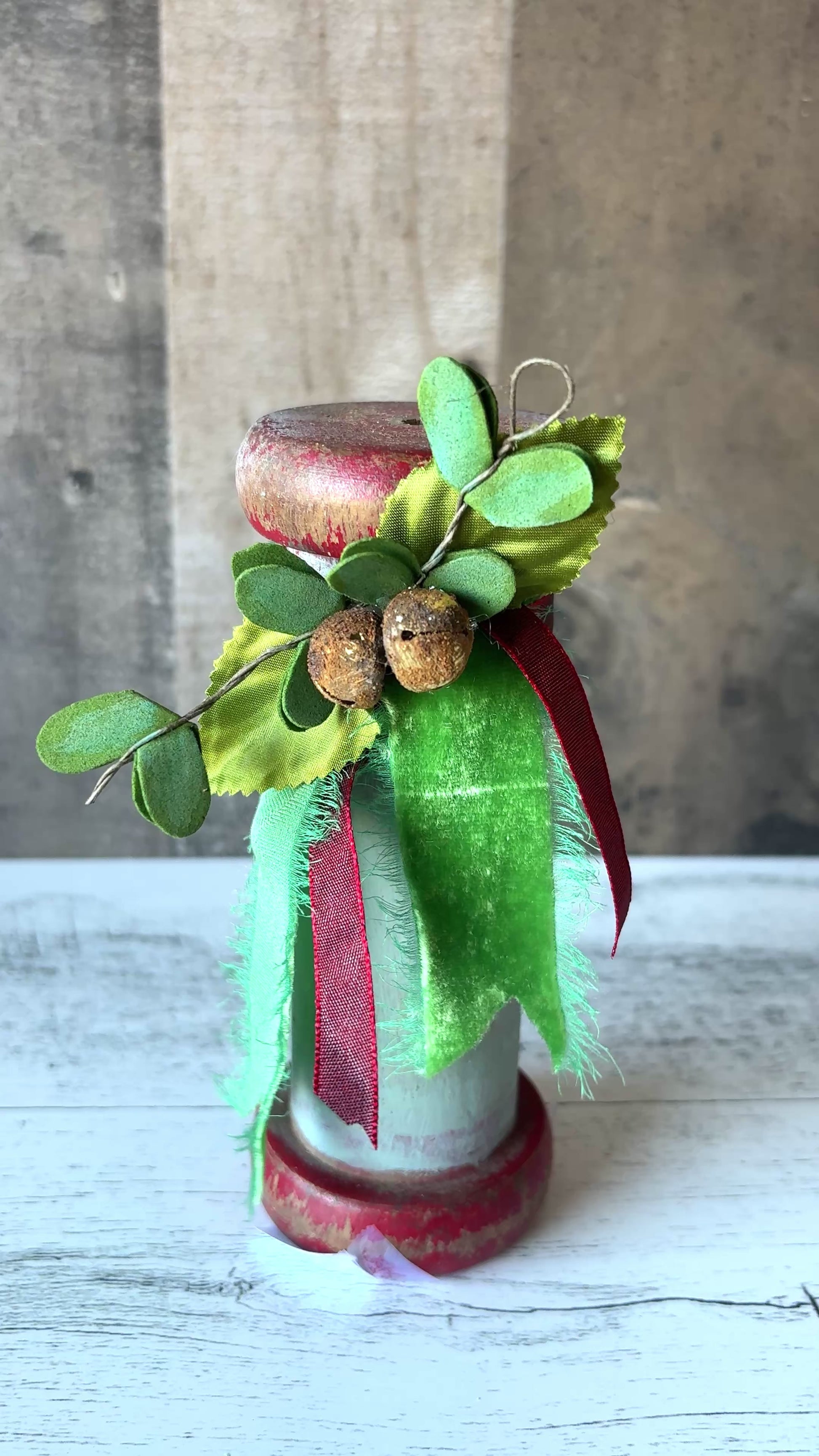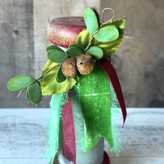 Primitive Christmas Spool Decor with Velvet Ribbon & Rustic Bells