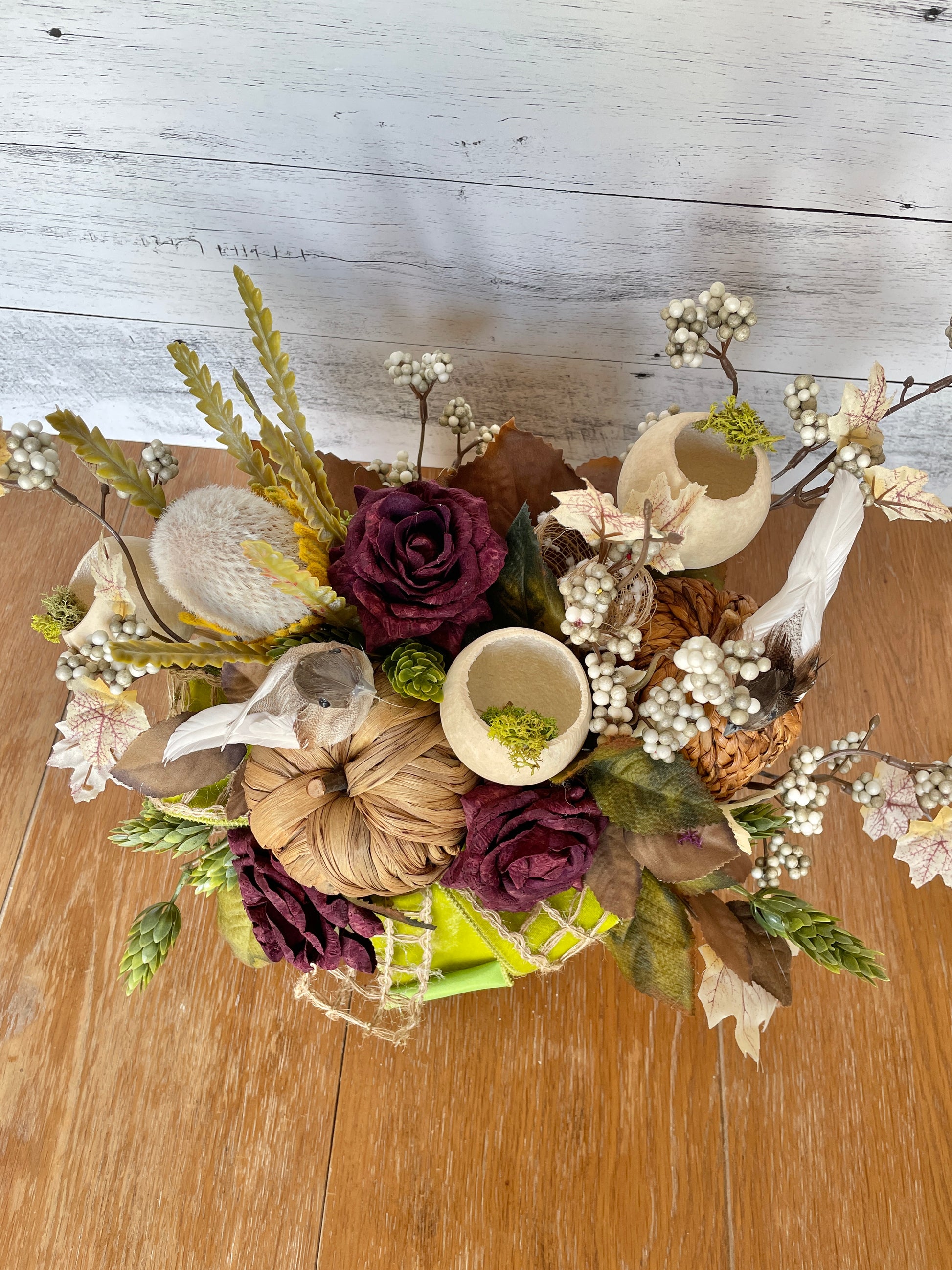 - Handcrafted fall floral arrangement with pumpkins and proteas