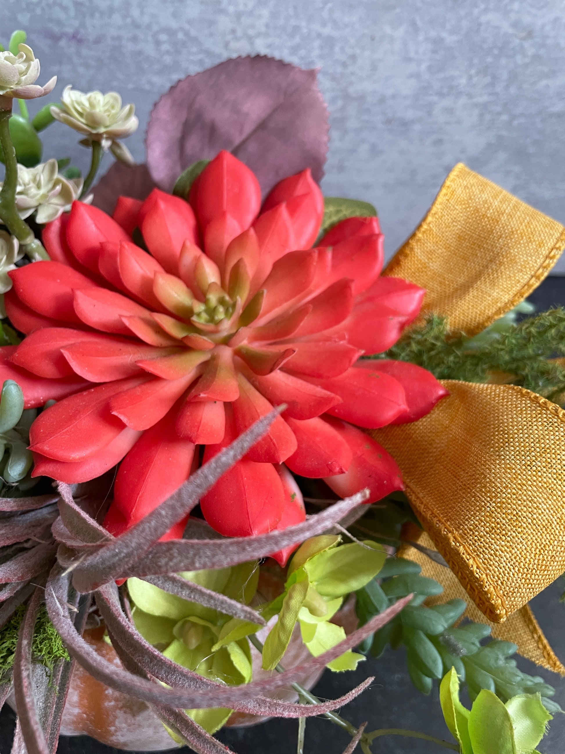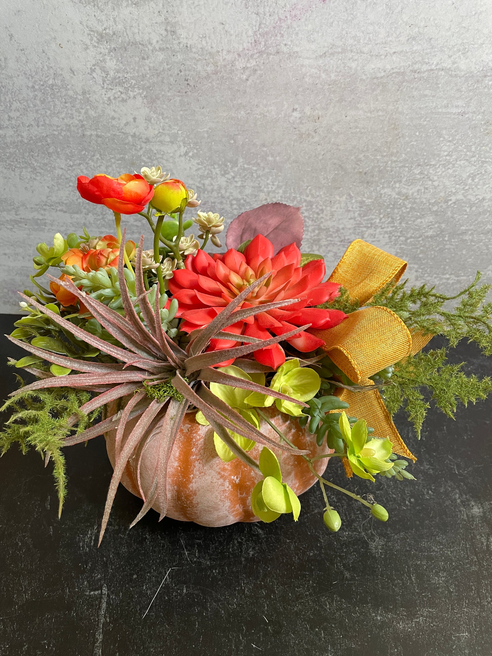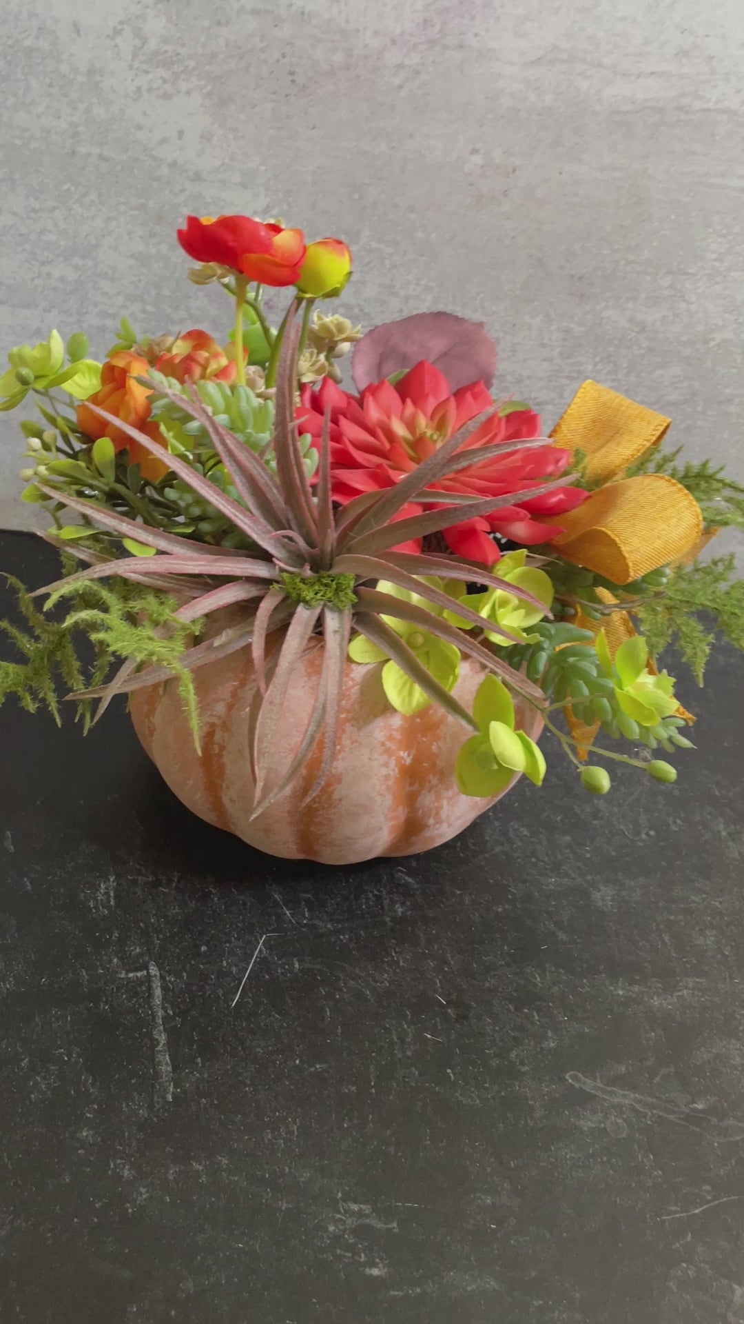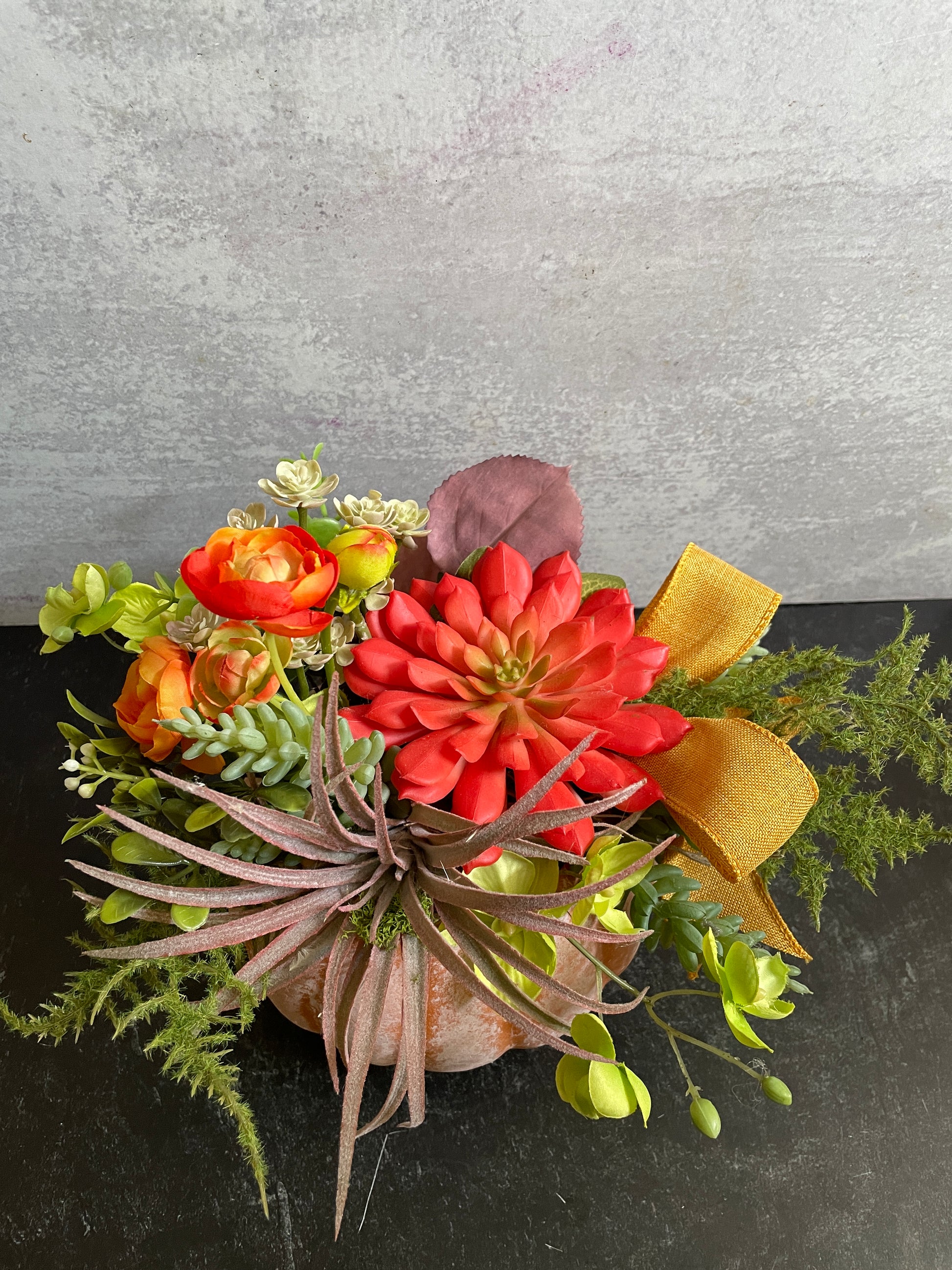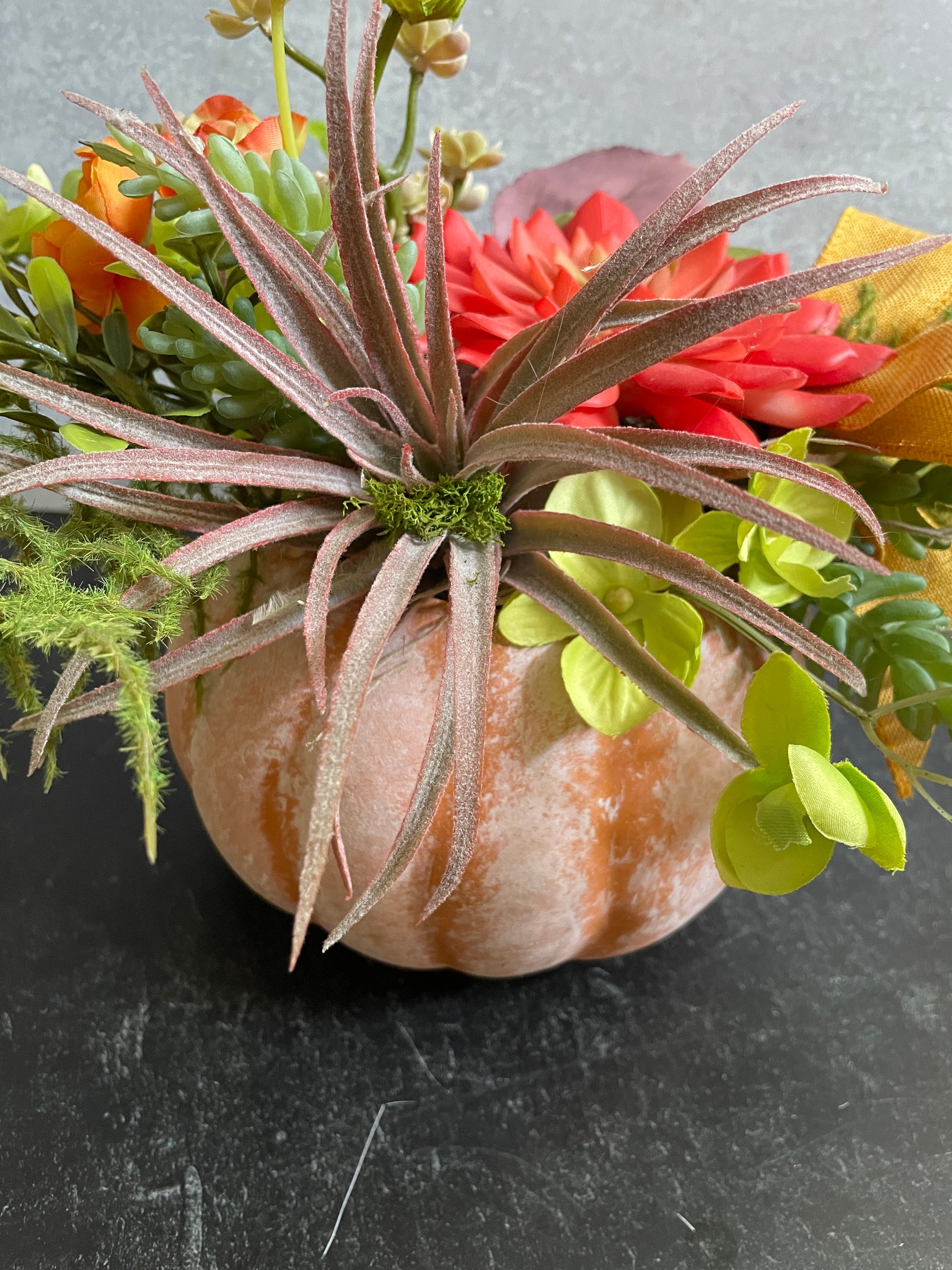 🌵 Succulent Serenity: Nestled within the pumpkin, you'll find a delightful arrangement of faux succulents and air plants. These lifelike treasures add a touch of modern elegance and a splash of greenery to your decor, all without the need for care.