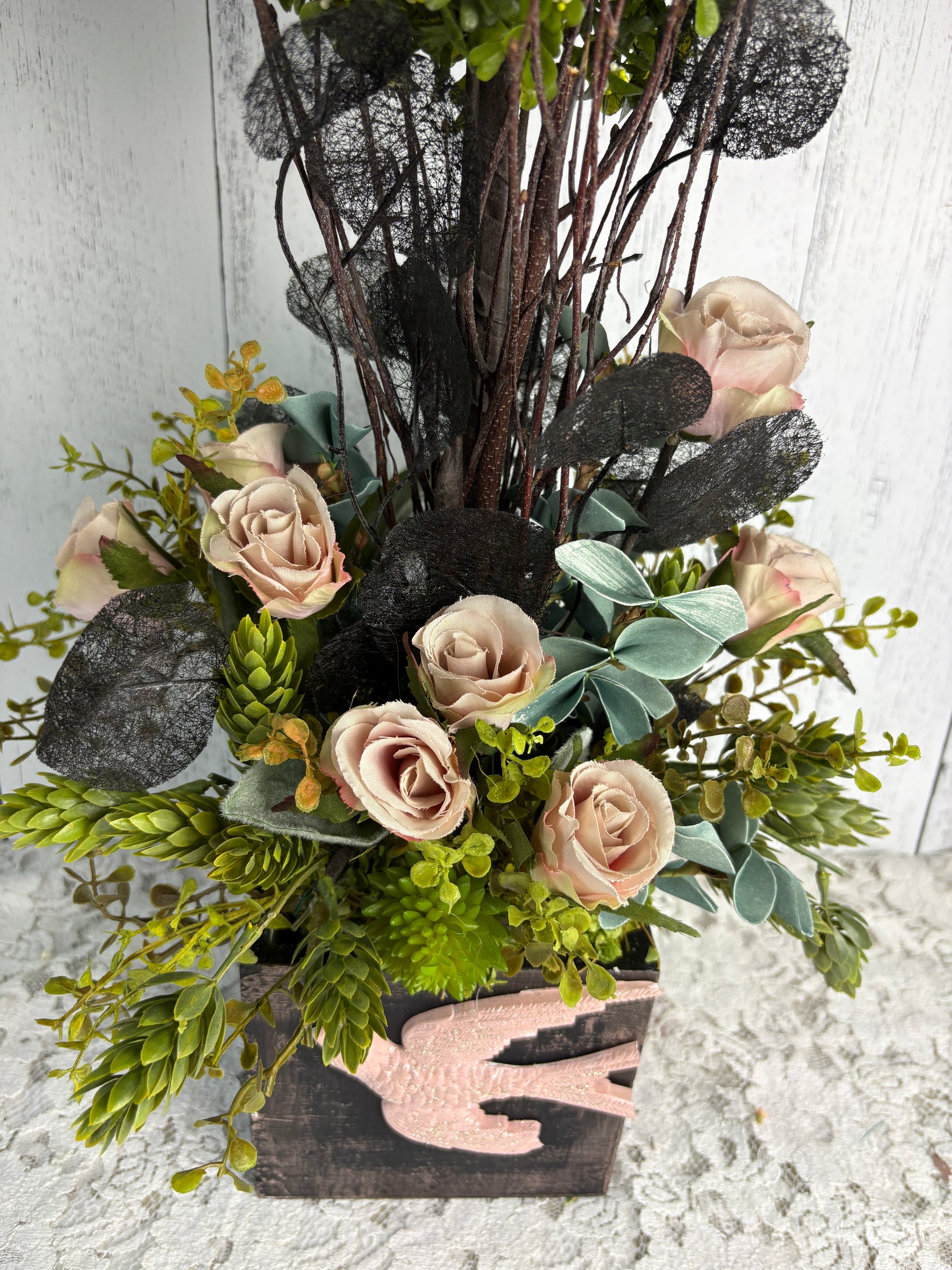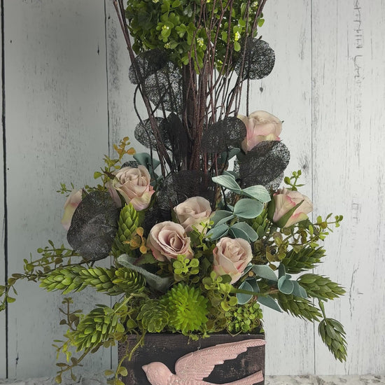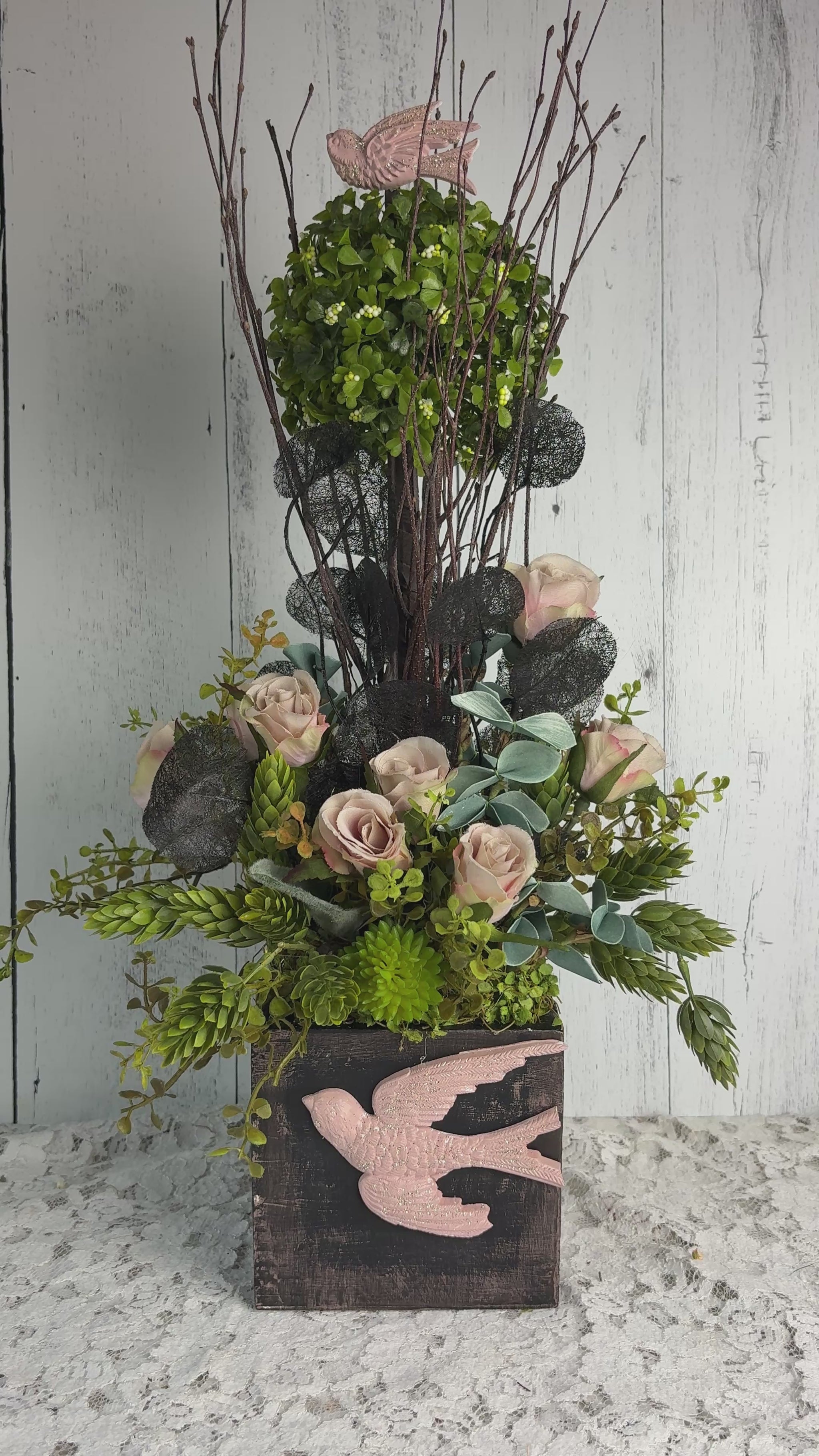 Rising gracefully from a dark wood cube base, the arrangement features soft blush roses, layered greenery, eucalyptus-style foliage, and natural twig branches that create movement and structure. Delicate bird accents—one perched above and another adorning the container—evoke a sense of home, peace, and gentle watchfulness. Subtle dark textural elements add contrast, grounding the piece with an artful, collected feel.