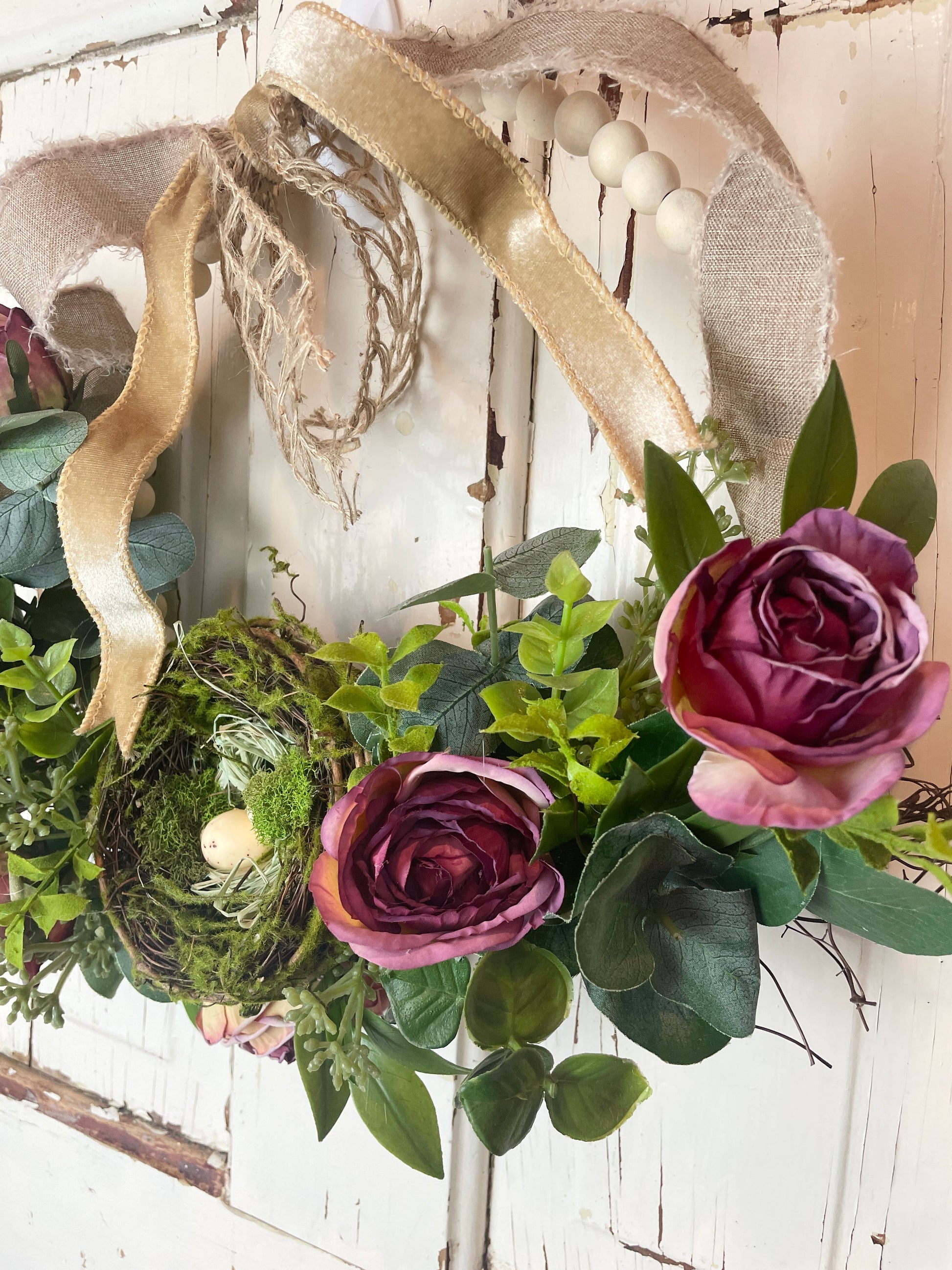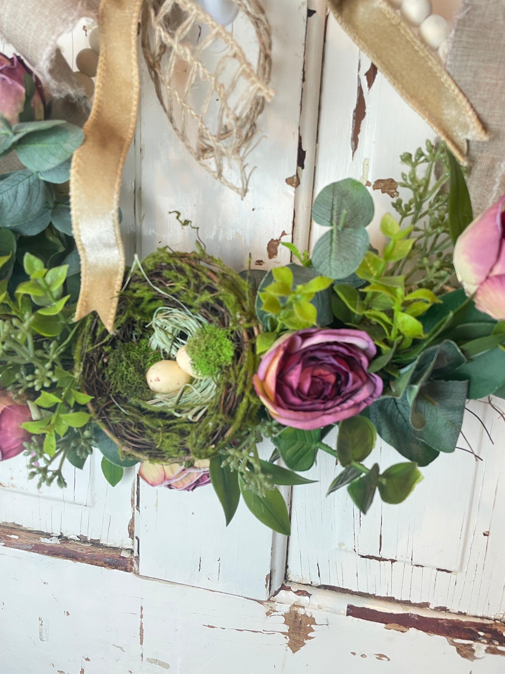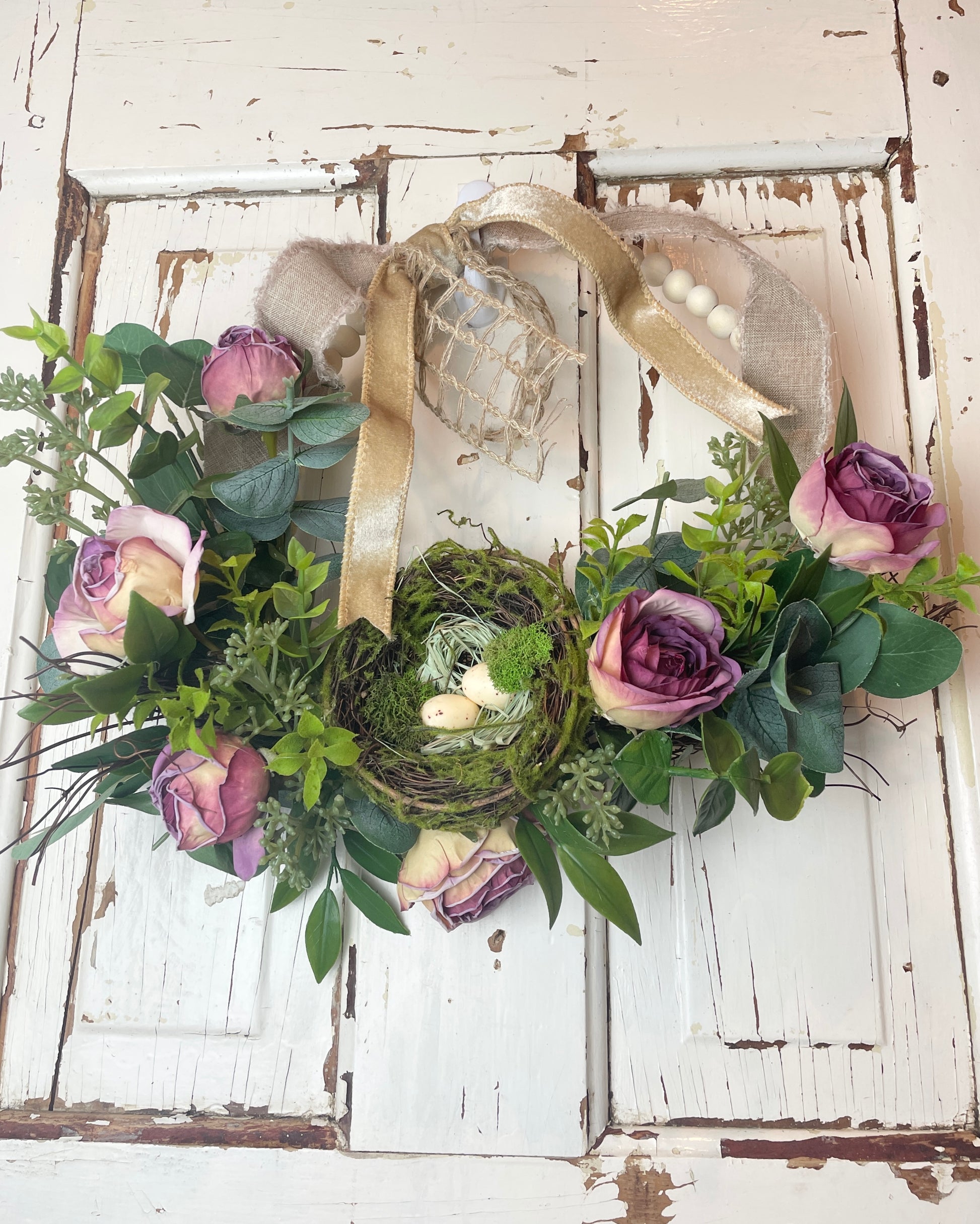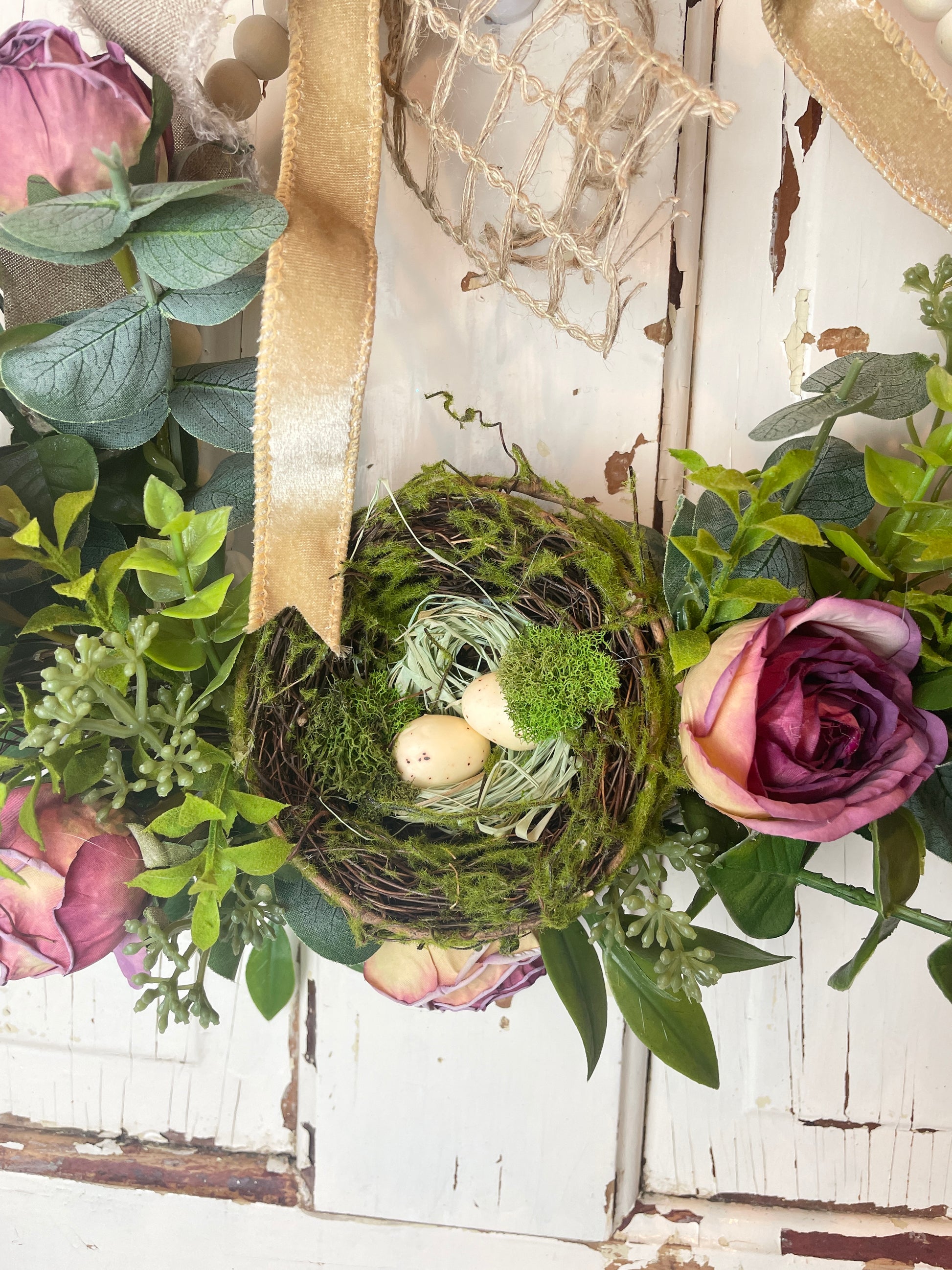 Embrace the beauty of romantic cottage style with this handcrafted rose and nest wreath, a perfect blend of vintage charm and nature’s elegance. 🌿🌸 Designed on a beaded wreath base, this delicate piece features lush mauve and cream roses, wild greenery, and a sweet mossy bird’s nest with speckled eggs, symbolizing renewal and serenity.