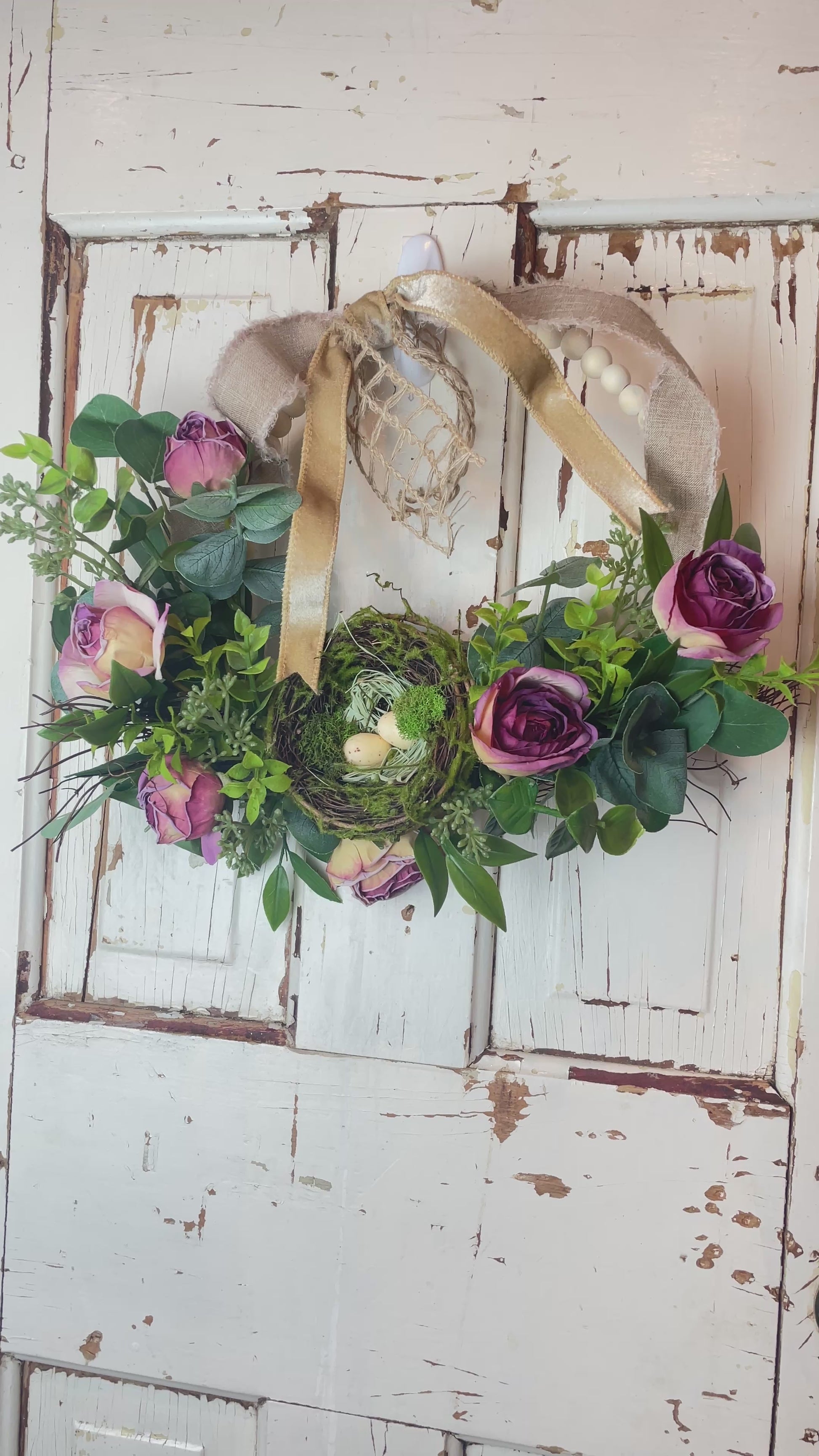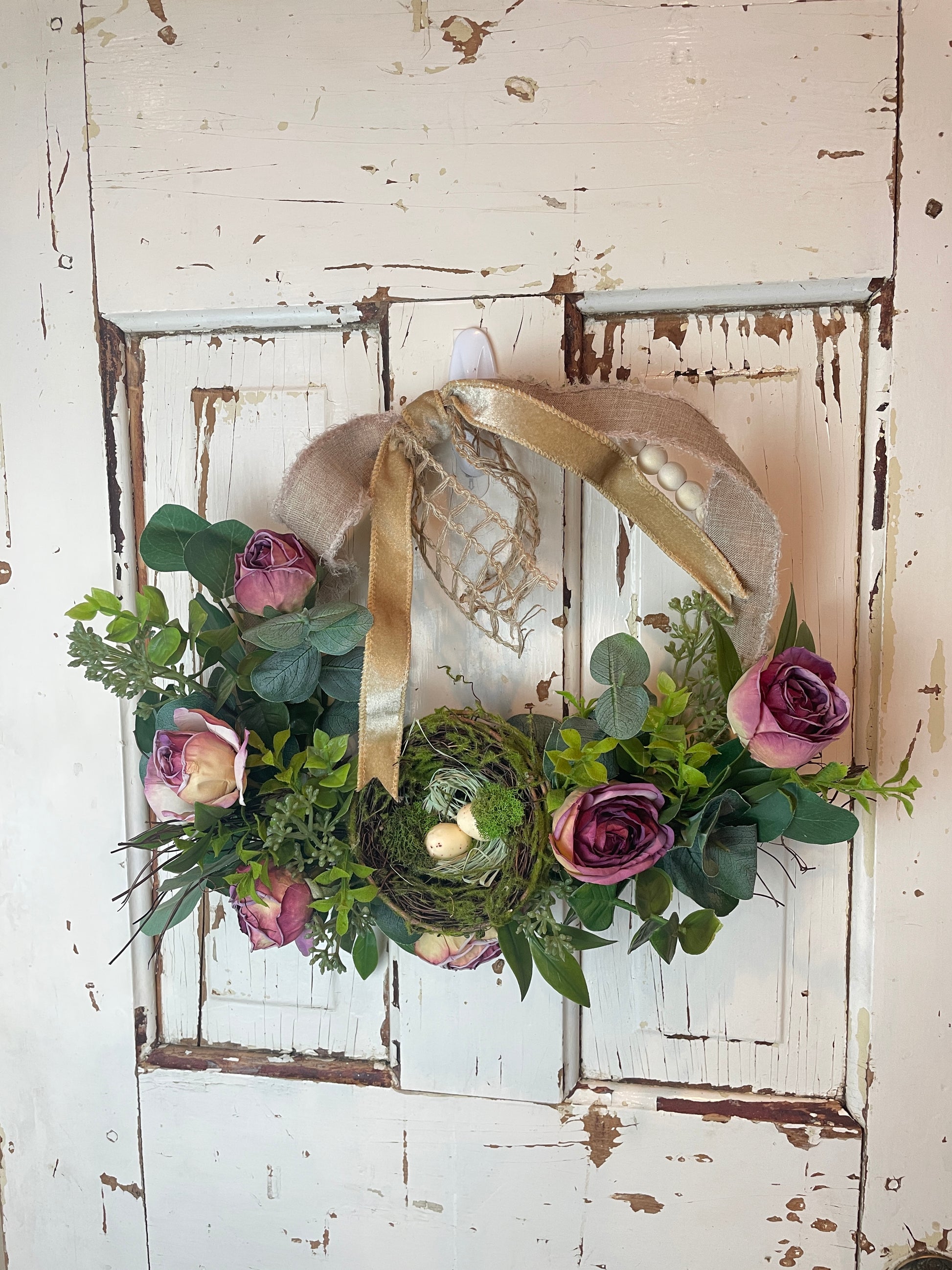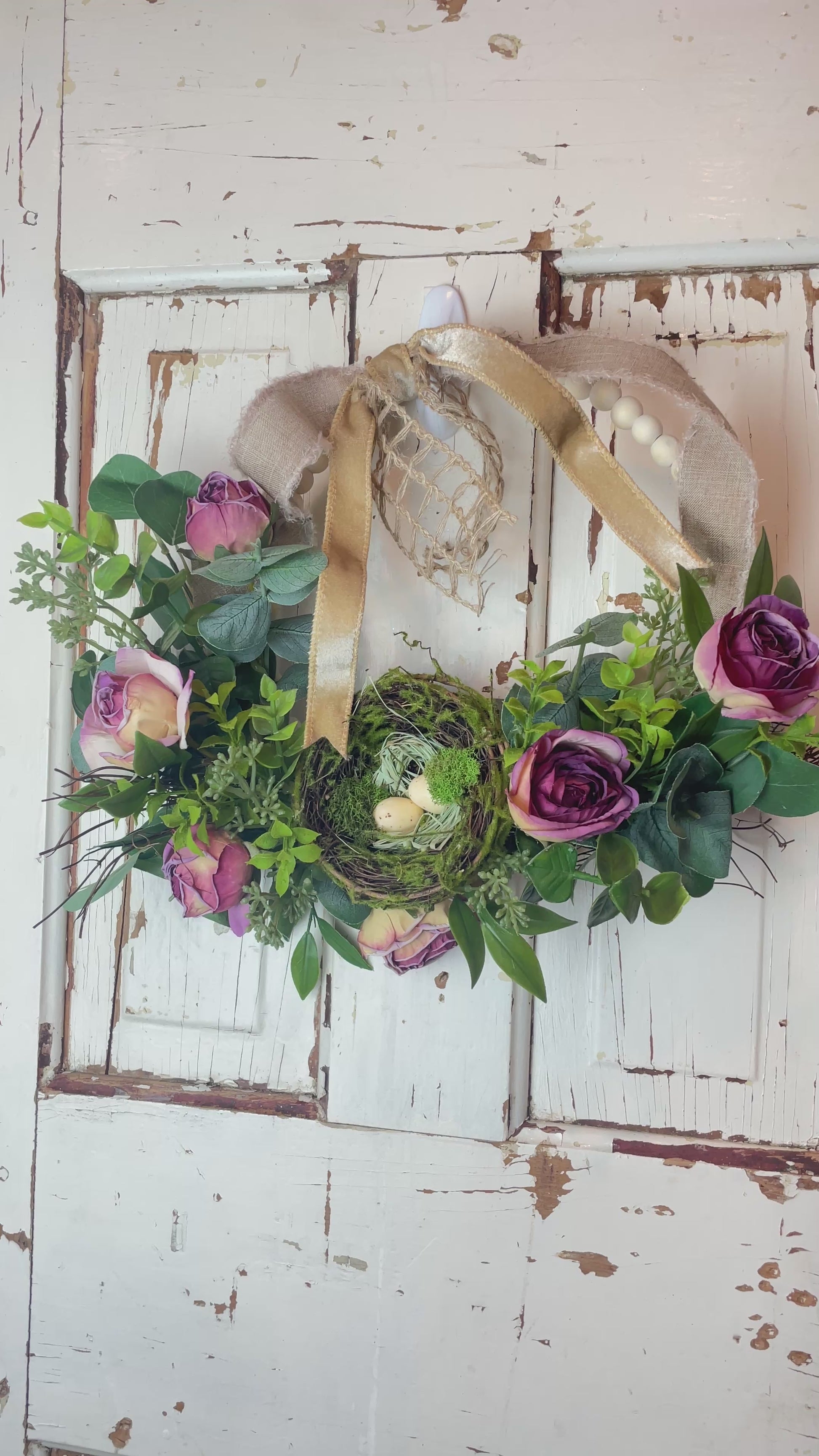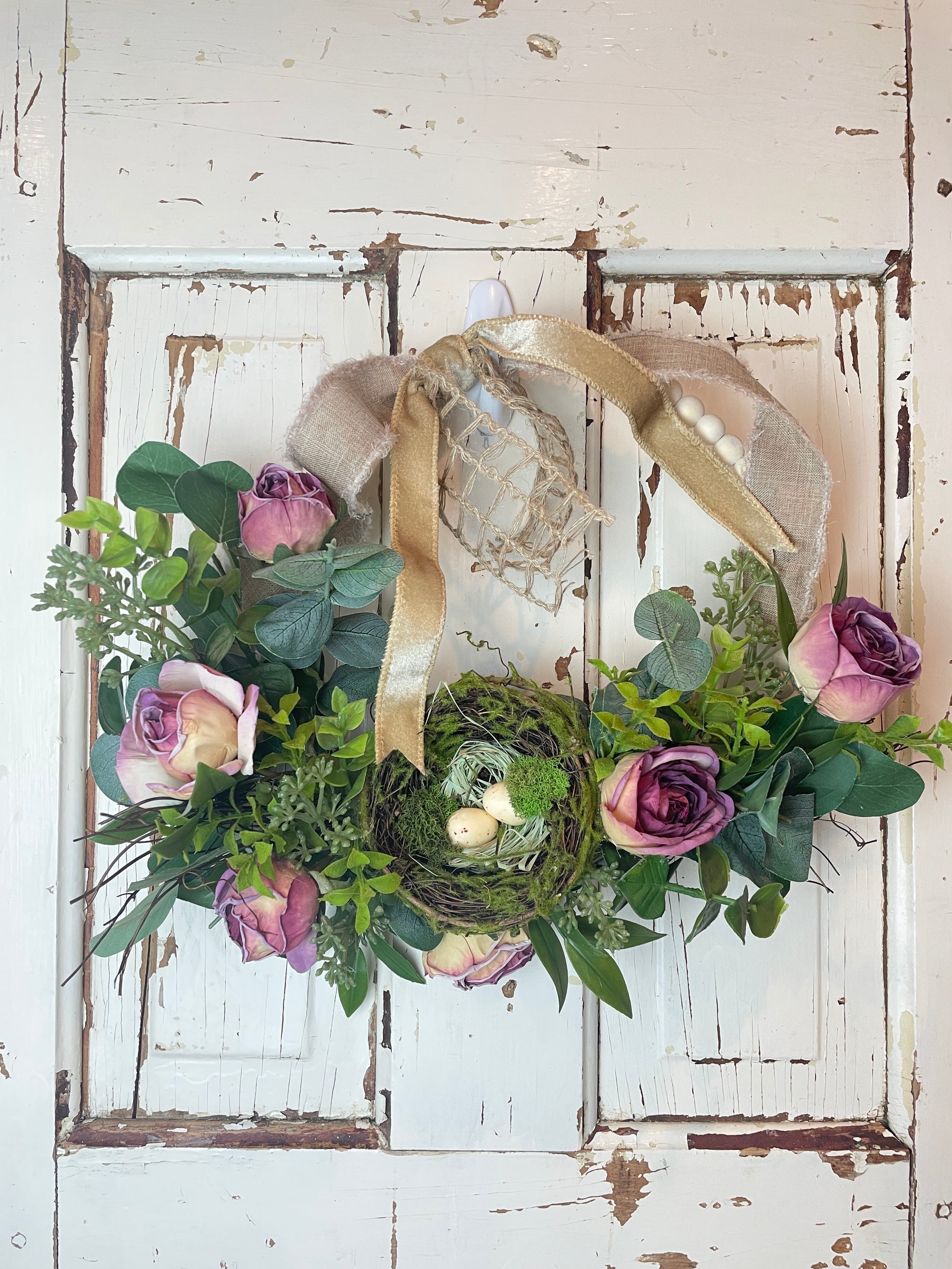 Embrace the beauty of romantic cottage style with this handcrafted rose and nest wreath, a perfect blend of vintage charm and nature’s elegance. 🌿🌸 Designed on a beaded wreath base, this delicate piece features lush mauve and cream roses, wild greenery, and a sweet mossy bird’s nest with speckled eggs, symbolizing renewal and serenity.