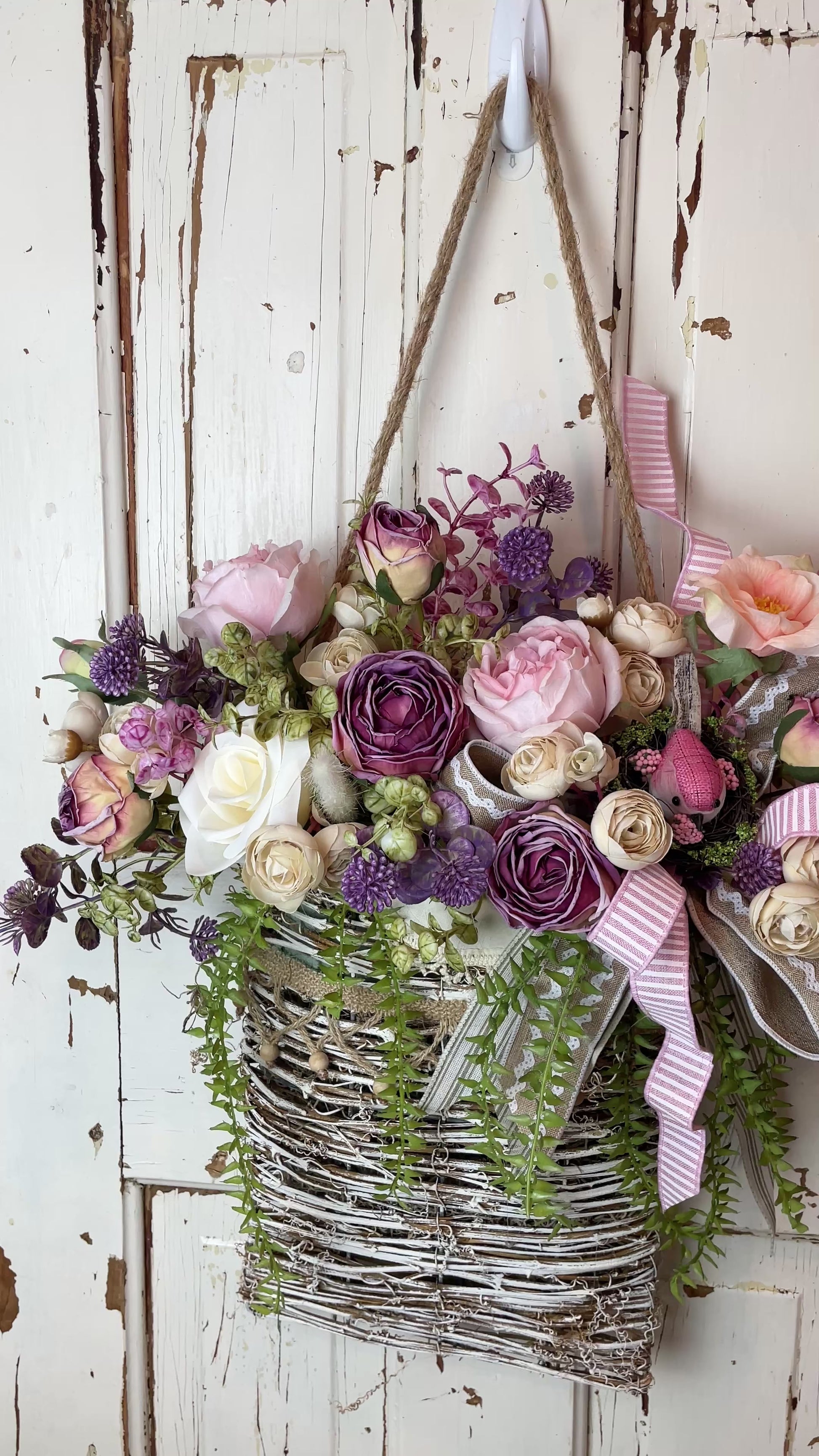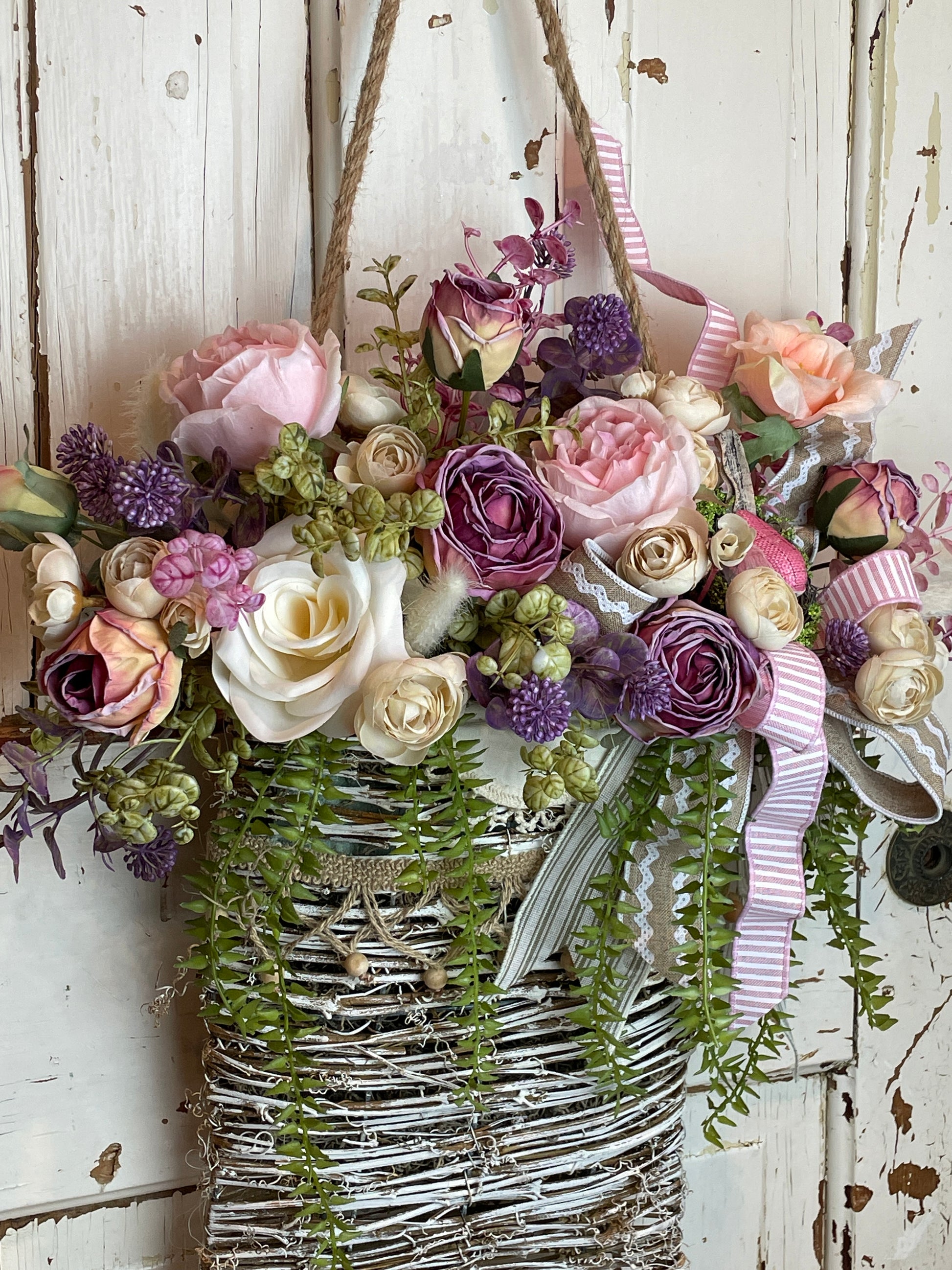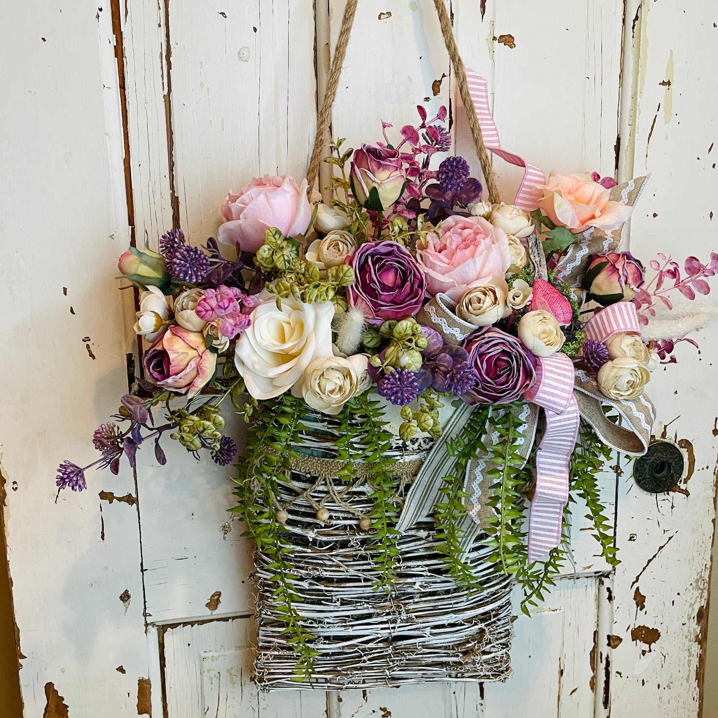 Add a touch of romantic charm to your home with this vintage-inspired floral wall hanging, featuring a beautiful blend of silk roses, wildflowers, and greenery, all nestled in a distressed whitewashed wicker basket. Designed with French country and shabby chic aesthetics, this arrangement is perfect for cottagecore lovers, farmhouse decor enthusiasts, or anyone seeking a soft, elegant floral accent.