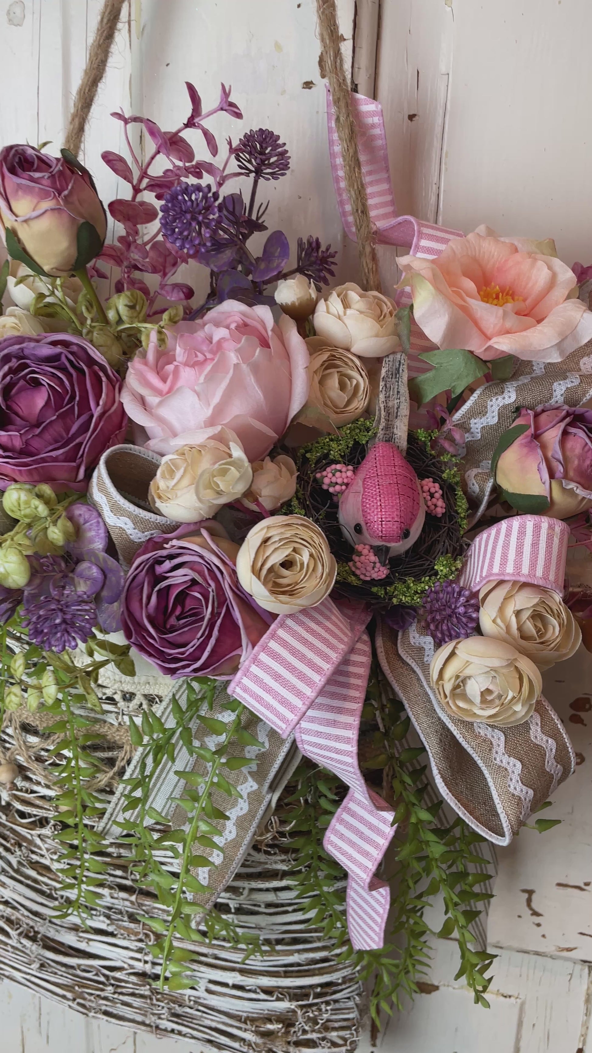 A delicate bird's nest with miniature eggs is tucked within the arrangement, symbolizing warmth, renewal, and home. Soft pinks, creams, and rich plum tones intertwine with lacy ribbon and trailing greenery, creating a timeless, handcrafted piece that brings nature indoors.