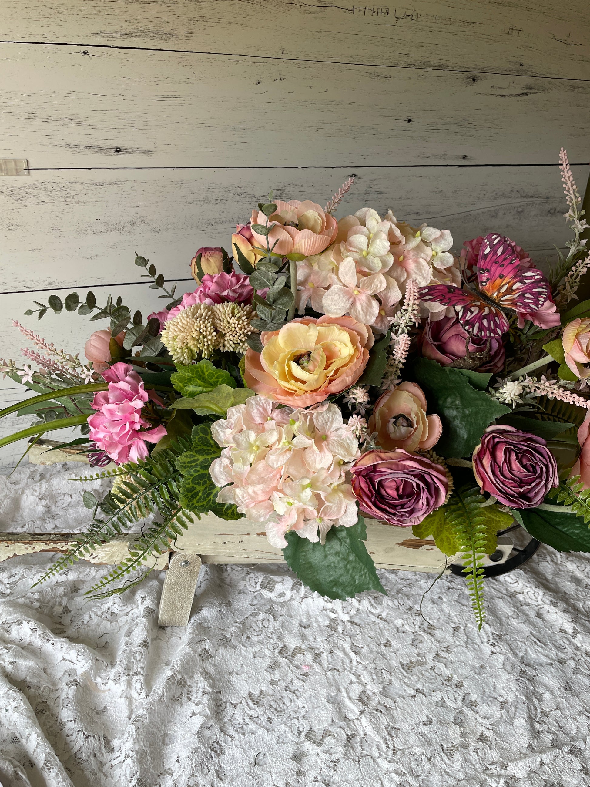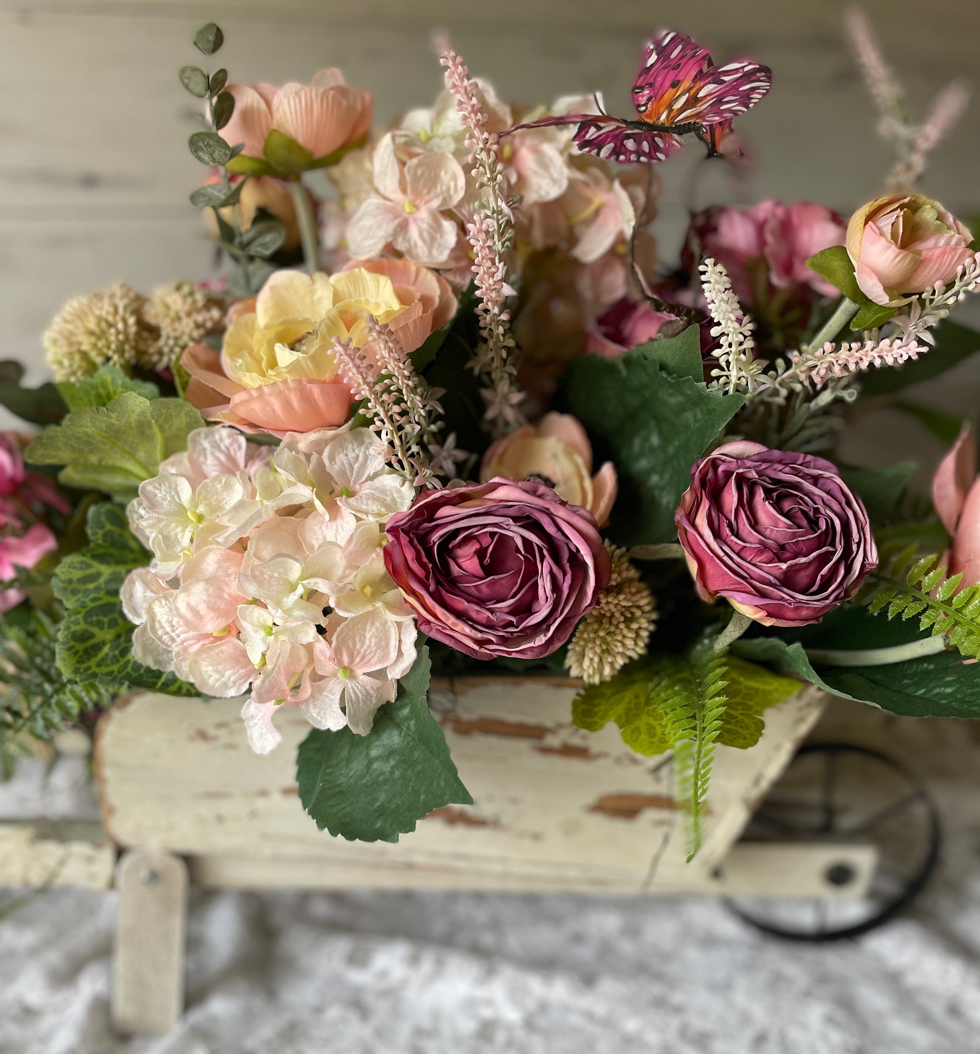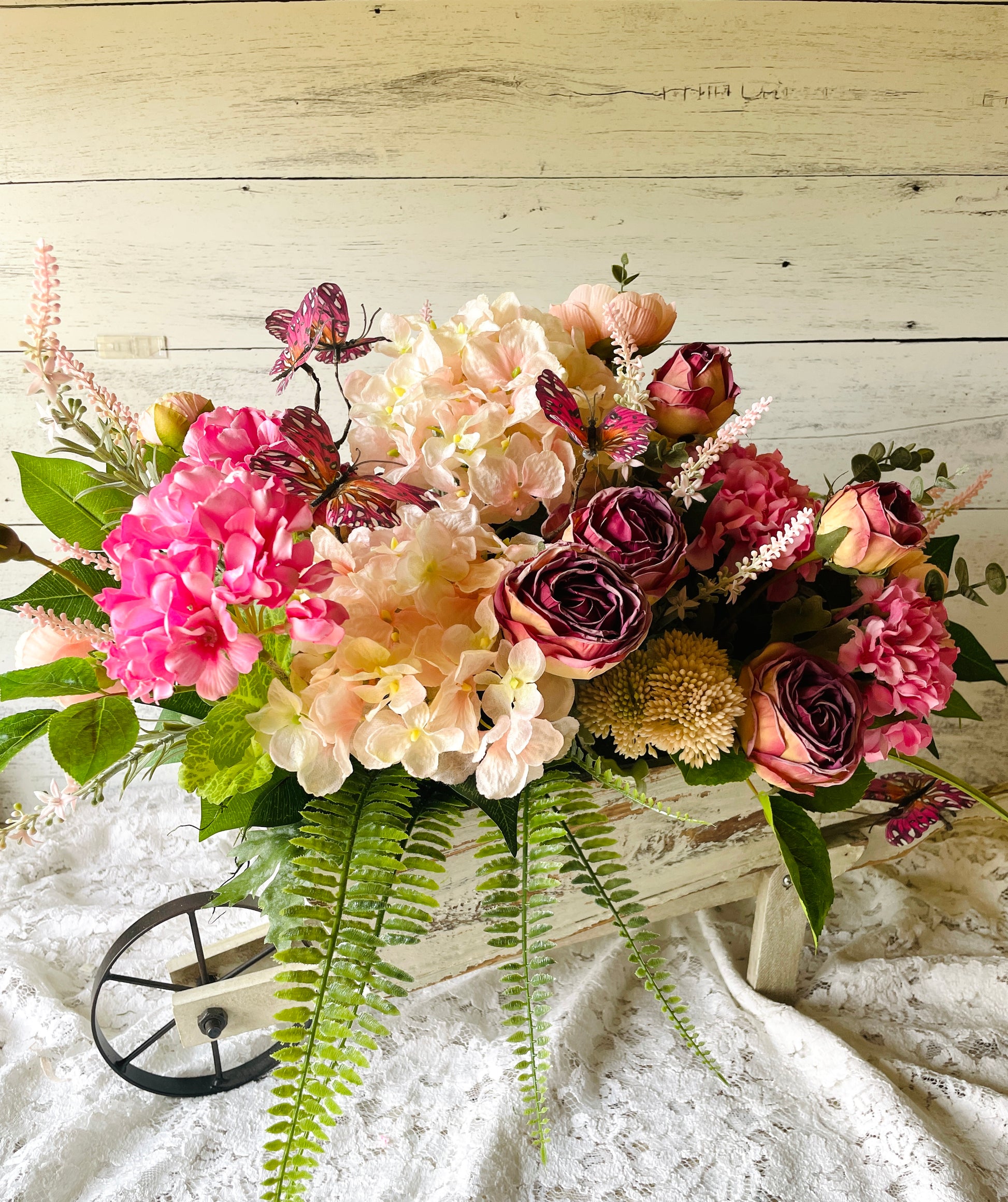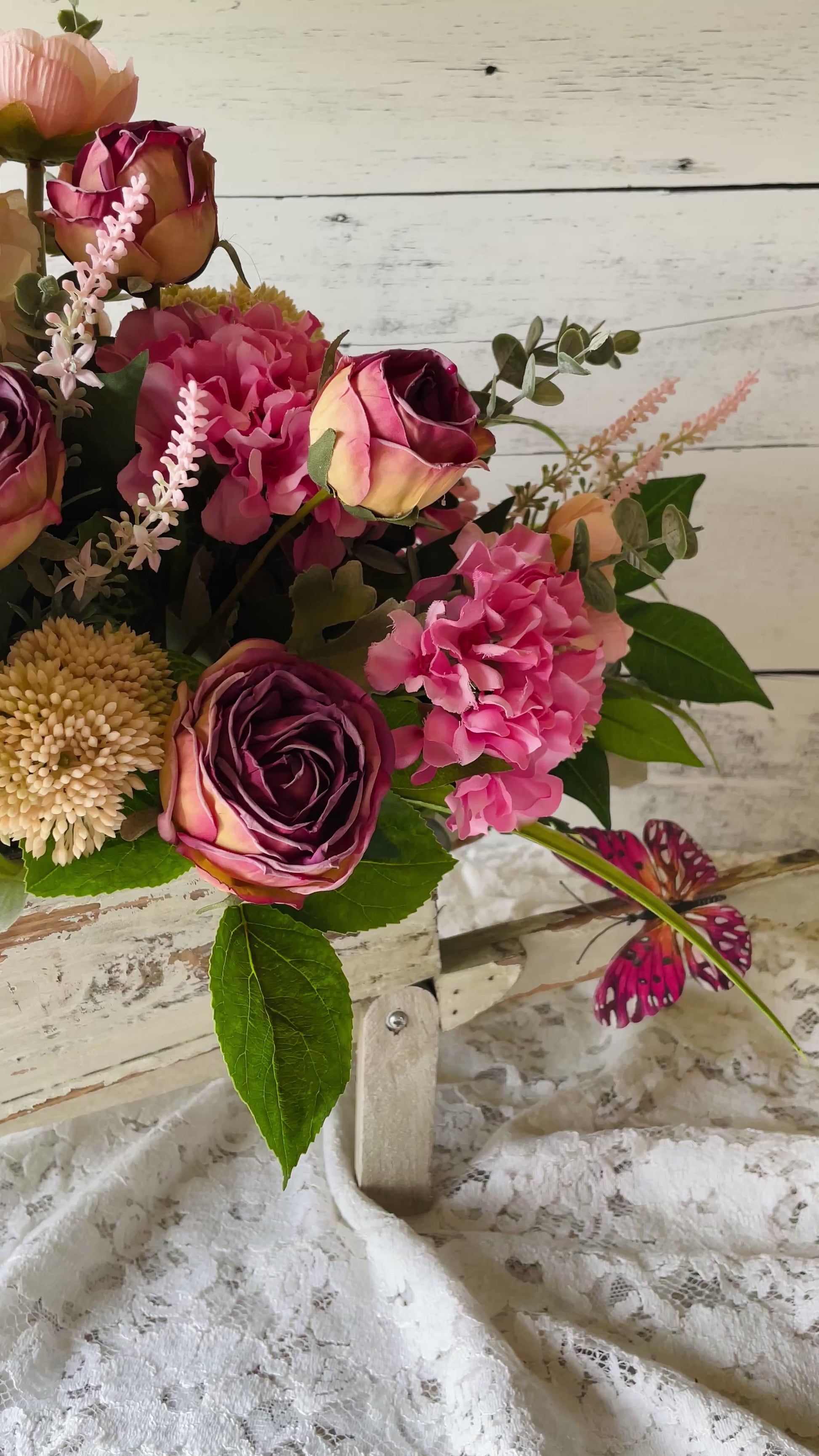 Bring a touch of spring garden magic into your home with this one-of-a-kind silk floral centerpiece by Lavender Blue Floral Artistry. Designed in soft peach, blush, and deep plum tones, this lush faux arrangement features lifelike hydrangeas, ranunculus, garden roses, and fern textures—all topped with a whimsical pink butterfly for a romantic, nature-inspired finish.