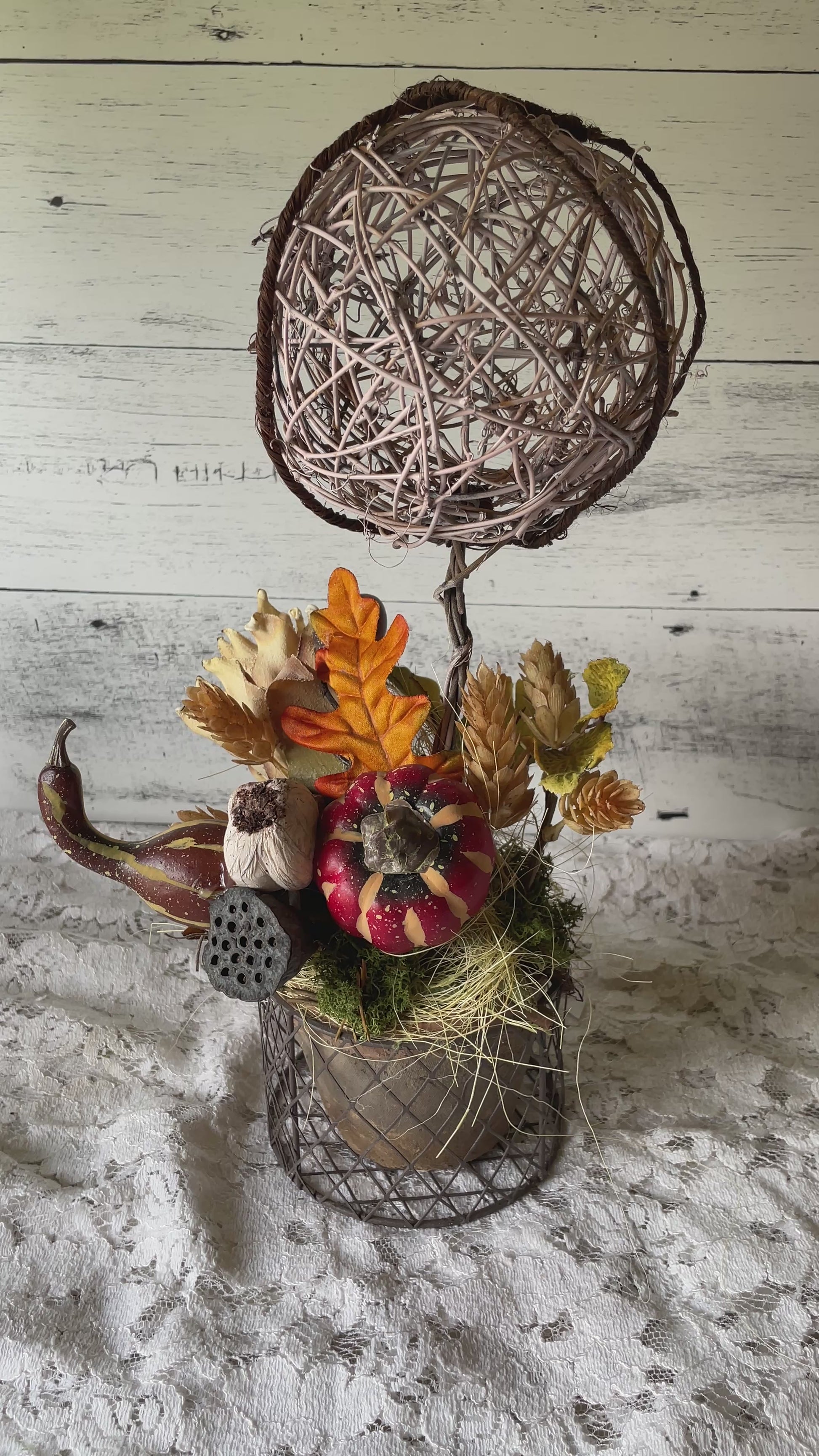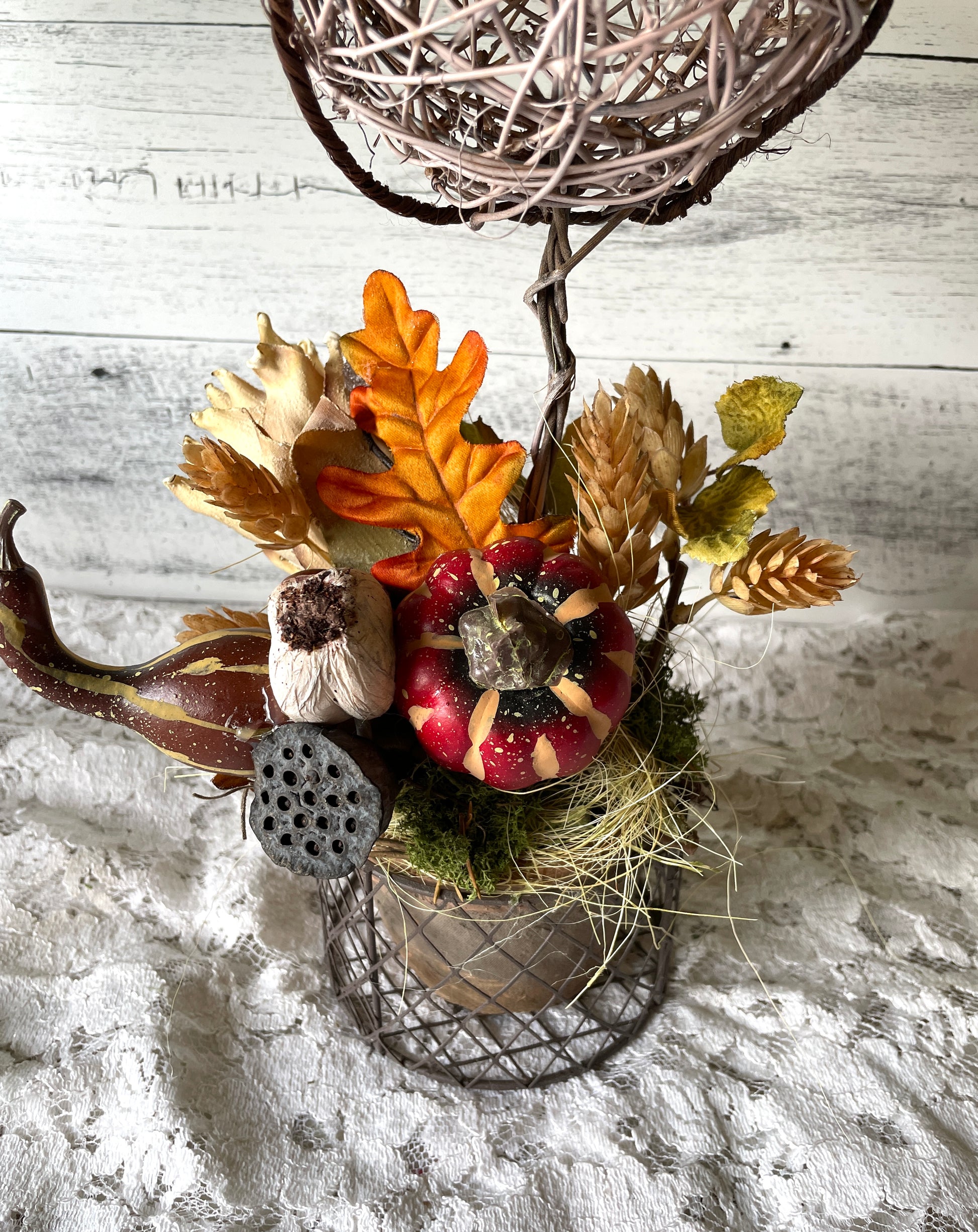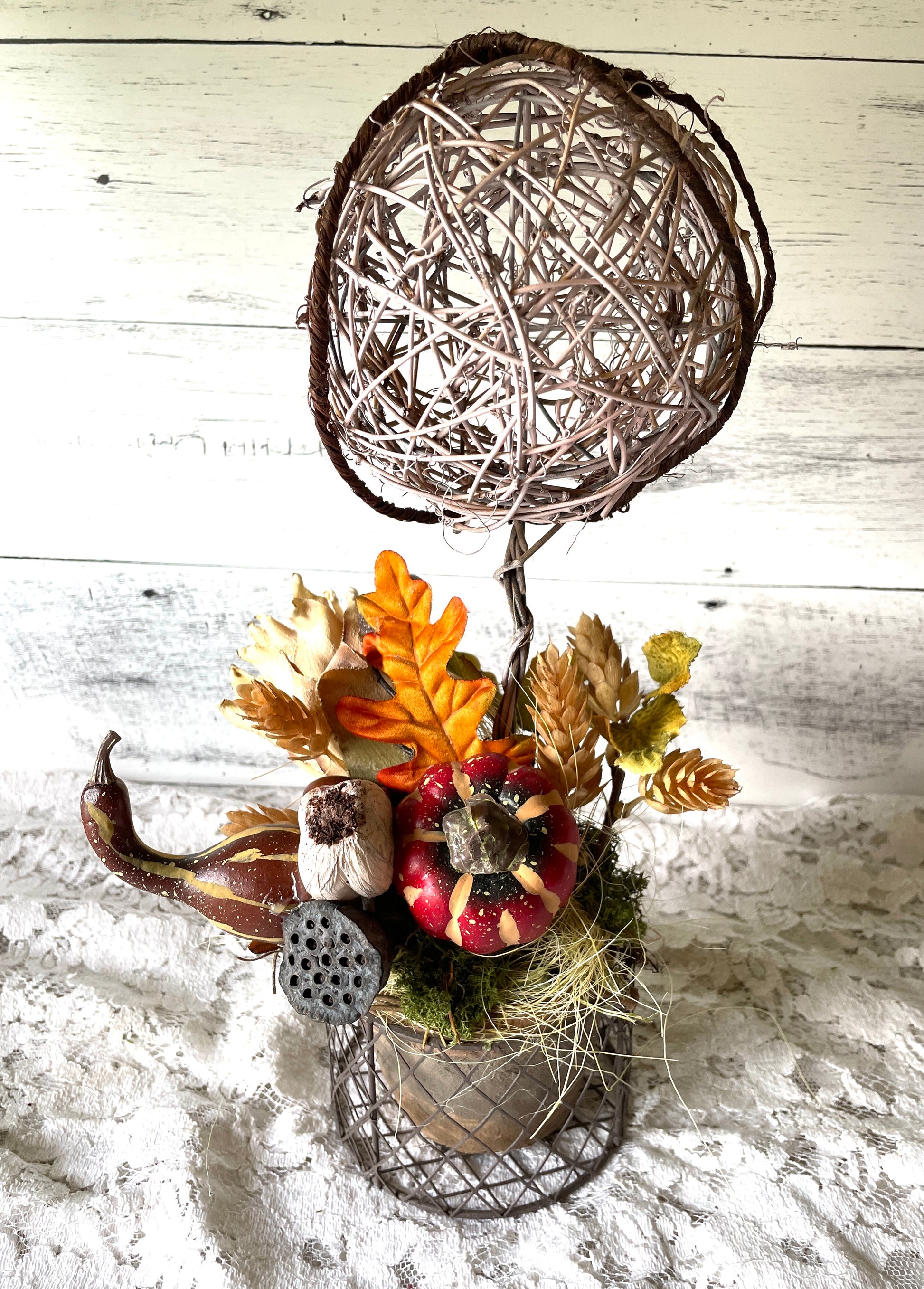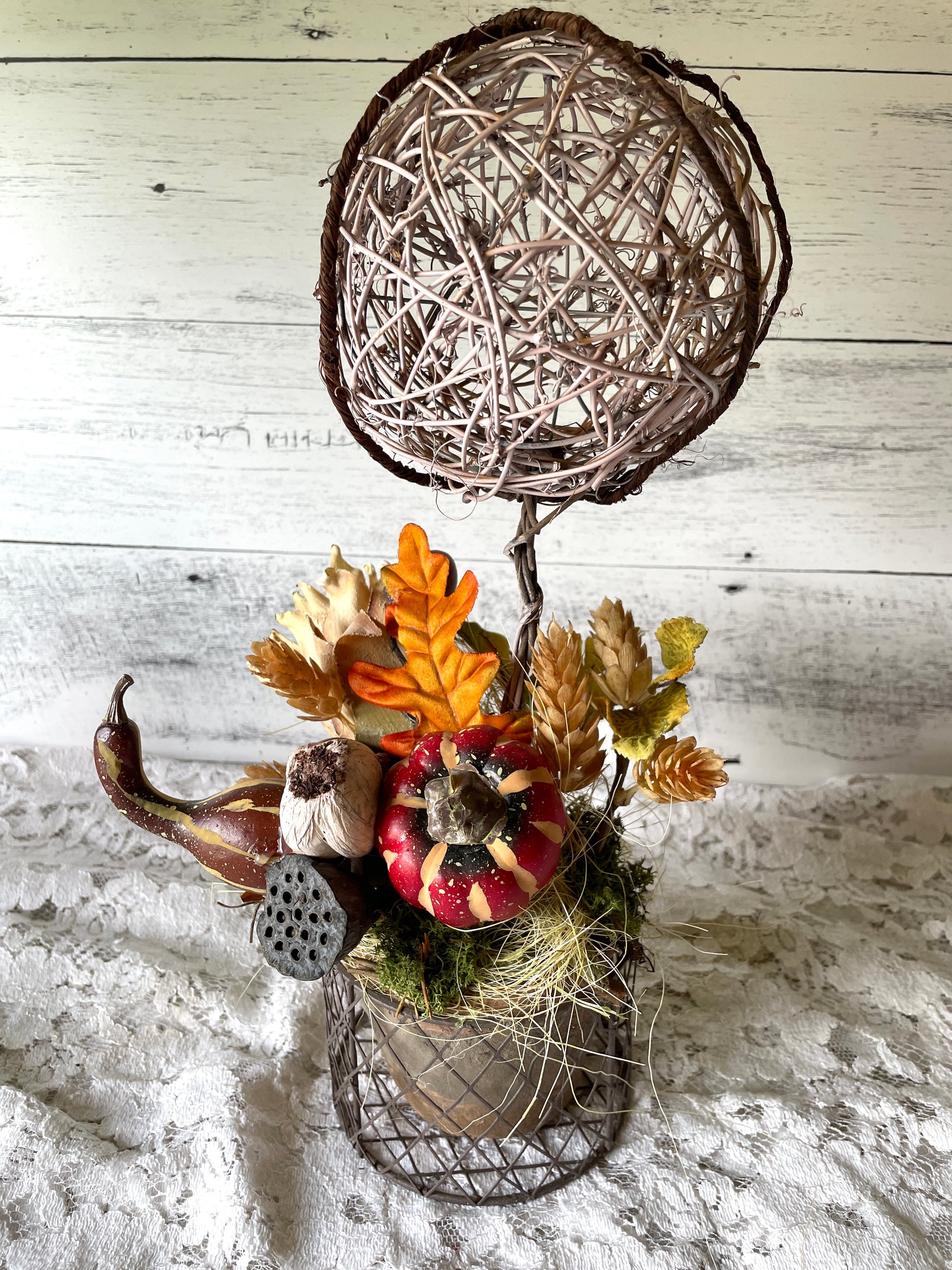 Celebrate the beauty of harvest season with this handcrafted fall topiary, designed with a woven twig sphere on a rustic metal base. The base is a terra cotta pot inside of a dark wire basket .Accented with a rich mix of autumn elements—including a painted mini pumpkin, lotus pods, faux gourds, fall leaves, and soft moss—this piece brings a warm, organic feel to any space.