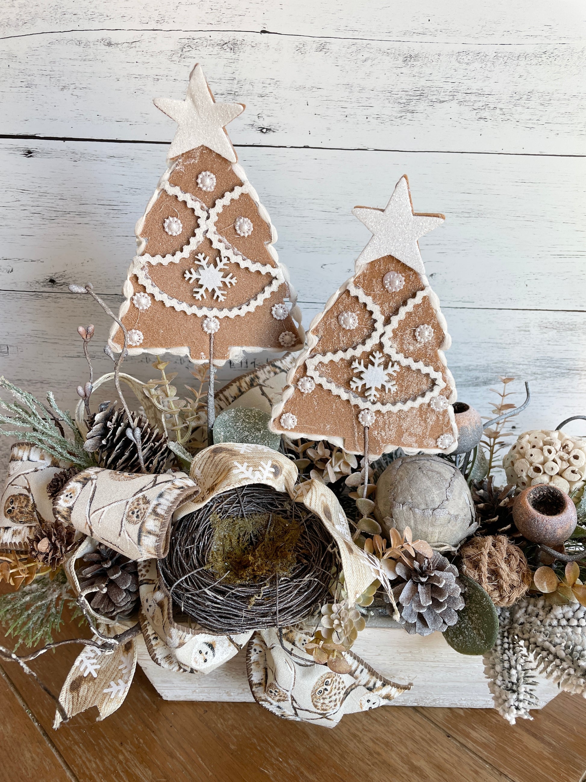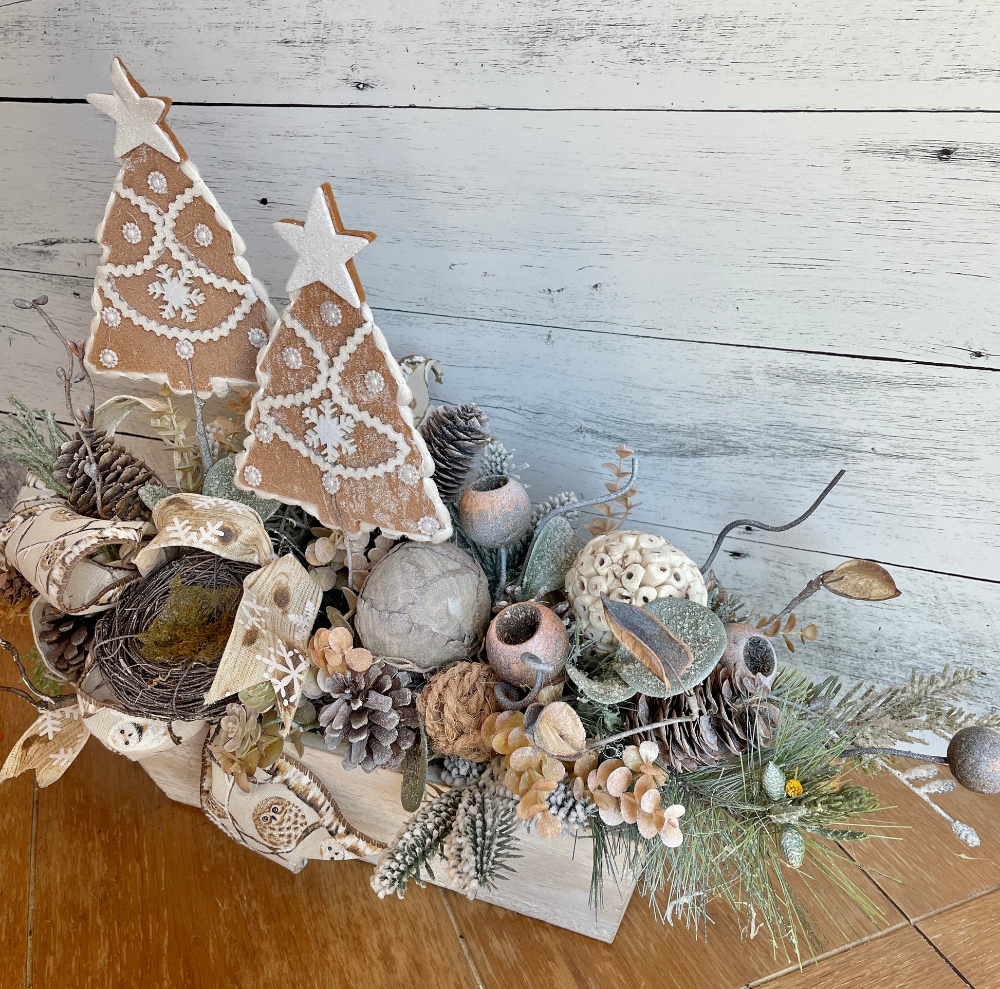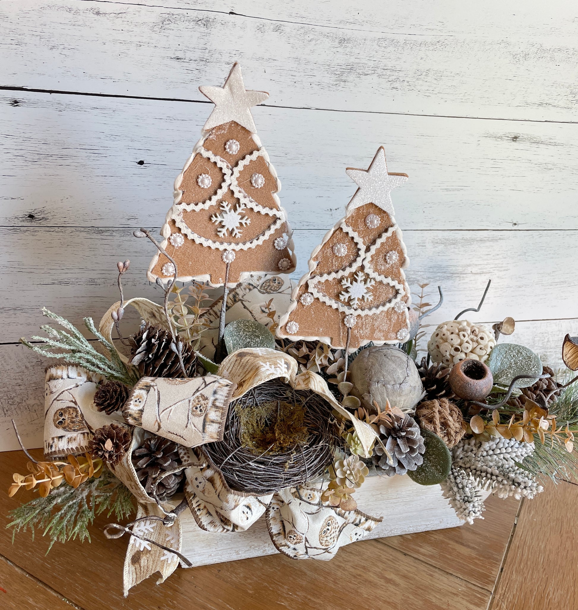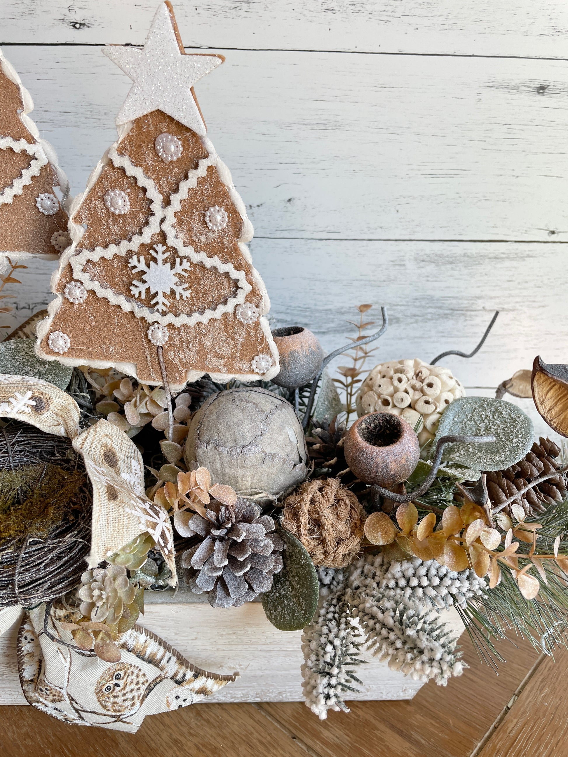 Rustic Woodland Winter Floral Arrangement with Gingerbread Trees