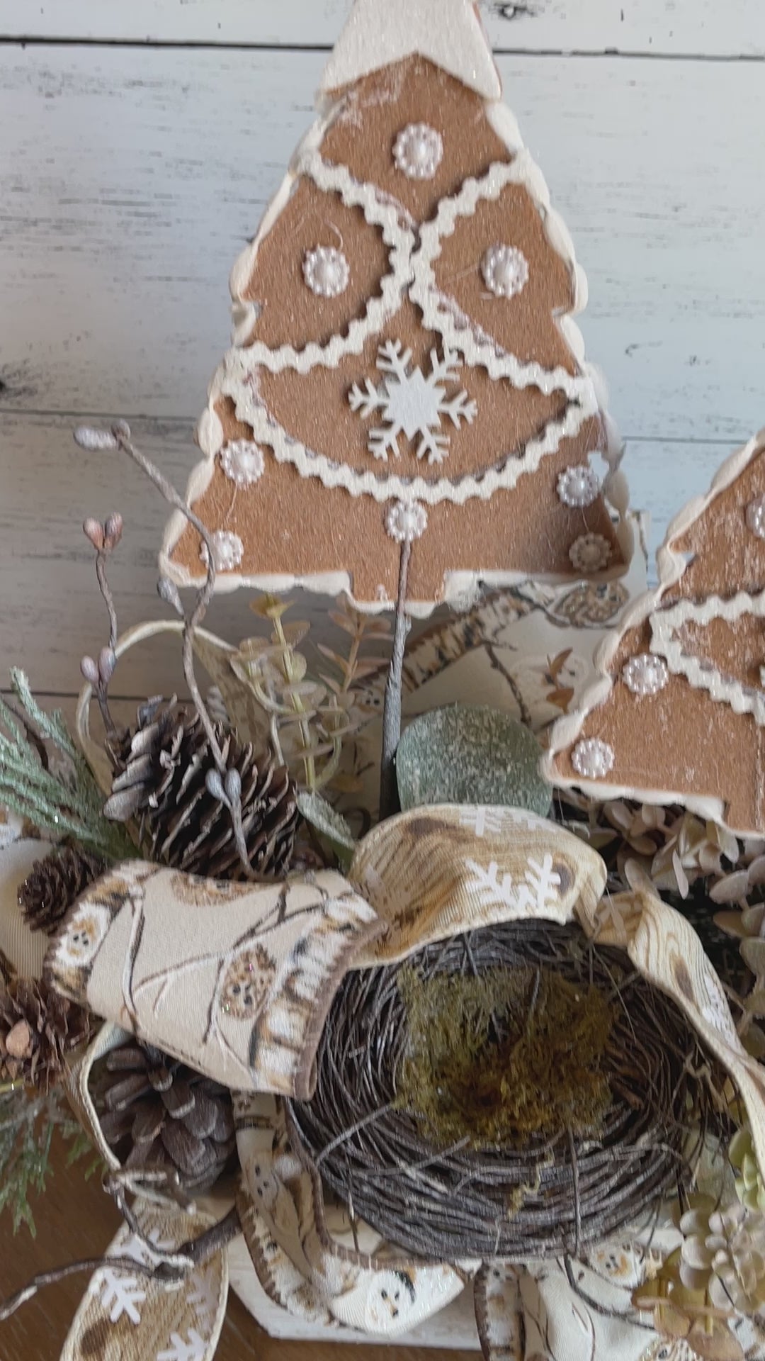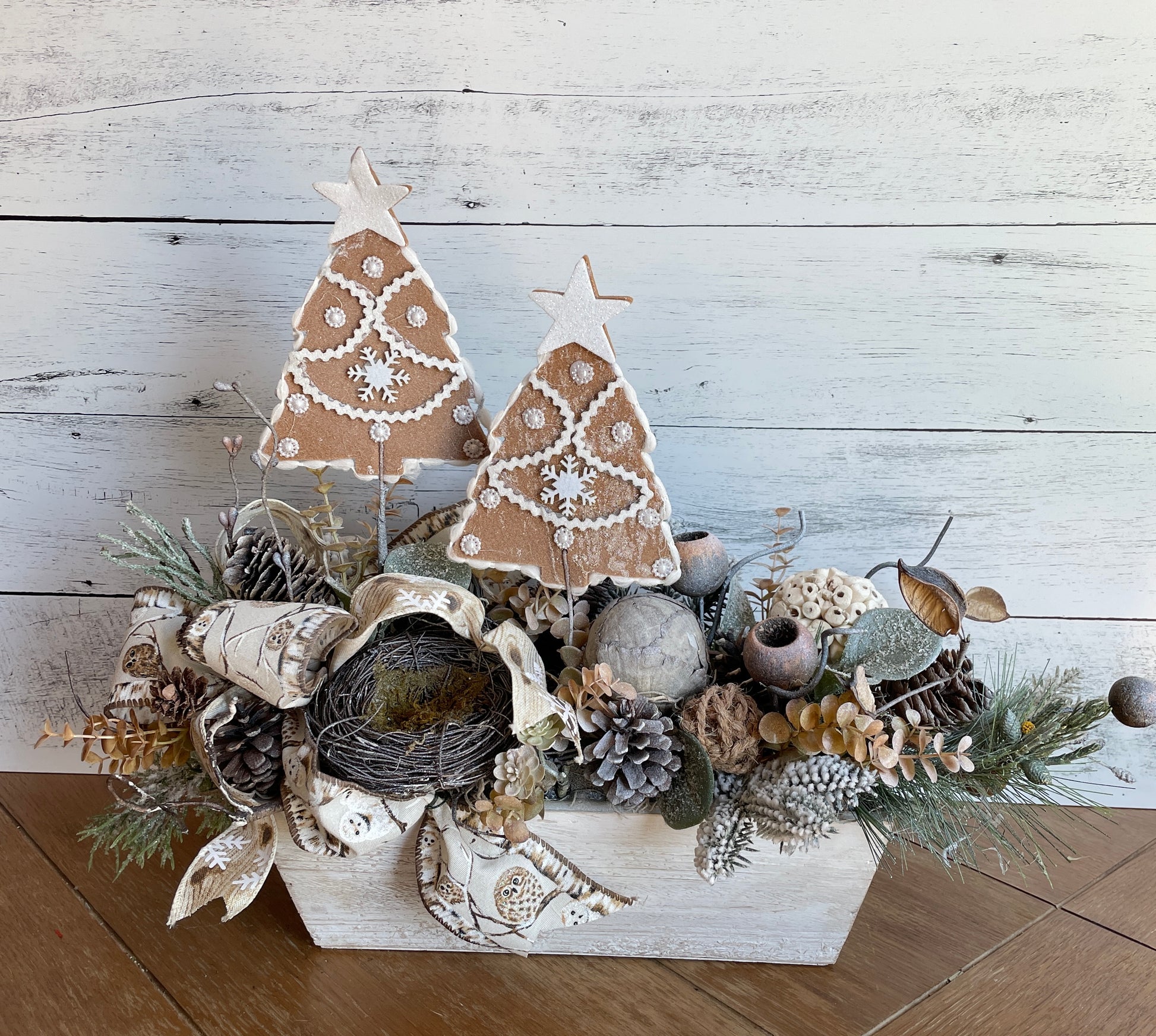 Step into a winter wonderland with our Rustic Woodland Winter Floral Arrangement featuring whimsical gingerbread Christmas trees, real pinecones, faux eucalyptus, and faux pine branches. This unique piece captures the serene beauty of the winter forest, adding a touch of natural elegance to your decor.