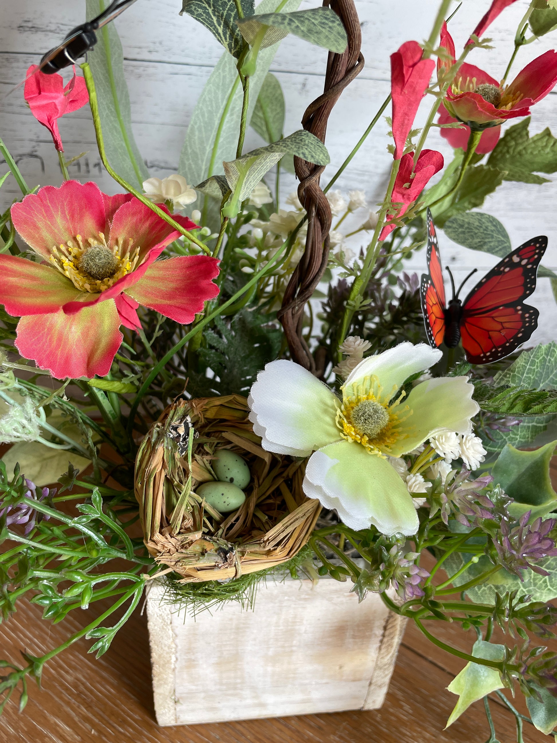 This piece is Not able to be displayed outdoors, where bright sun and unexpected weather elements will cause quick fading and aging of the flowers.
