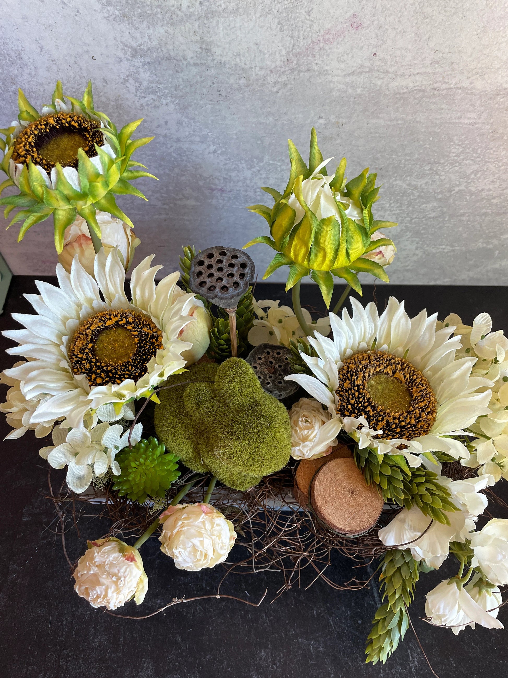 Premium silk sunflowers and dried-look roses are mixed with mosses and faux succulents in a woodland -inspired design