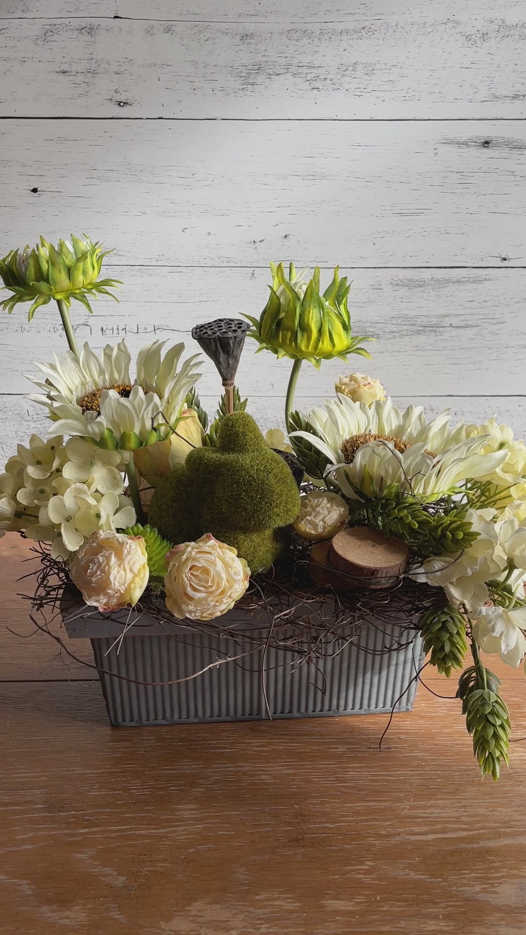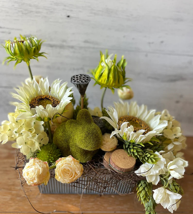 Bunnies and sunflowers come together in this one of kind arrangement with premium silk flowers and a moss covered critter!