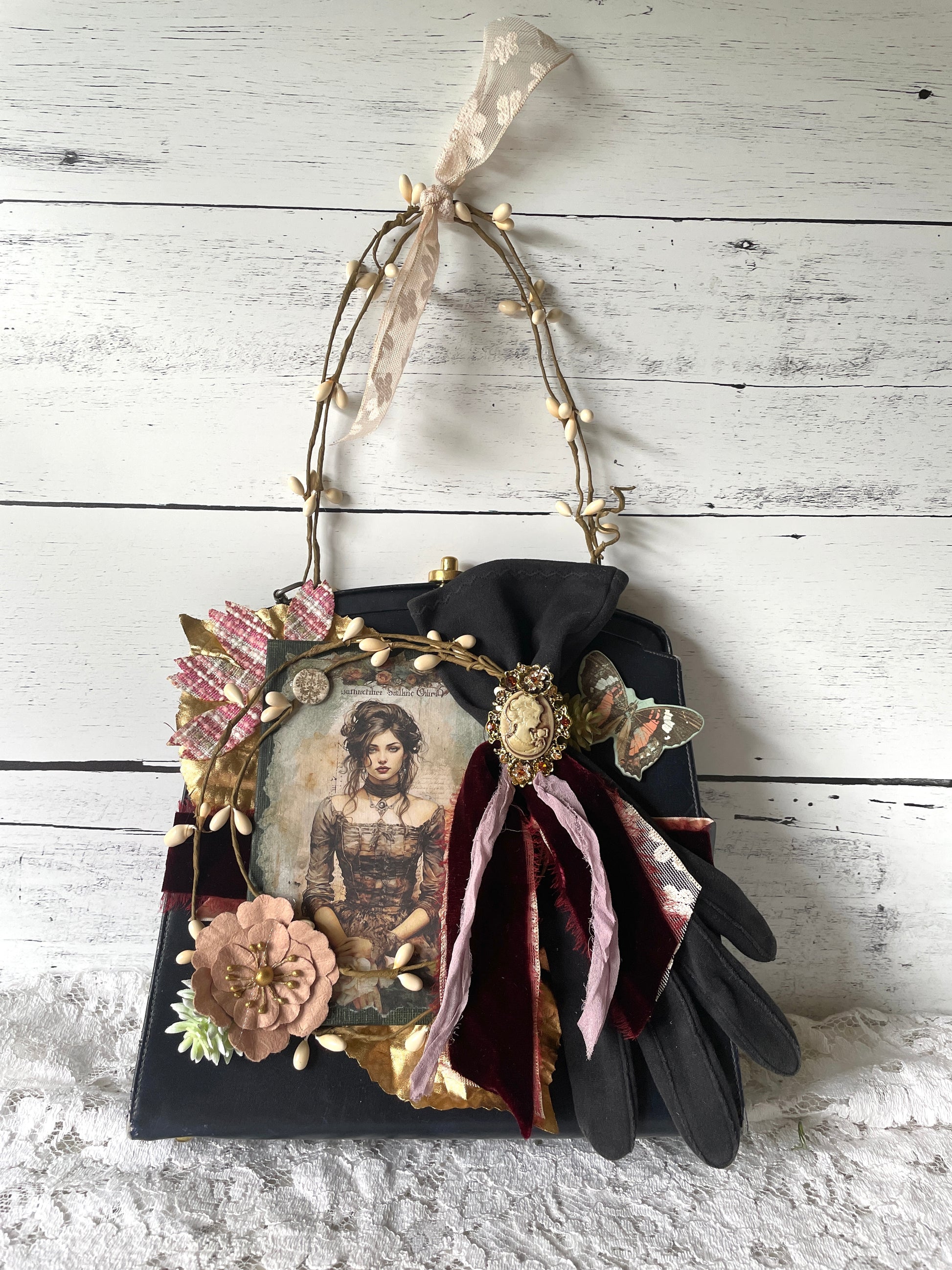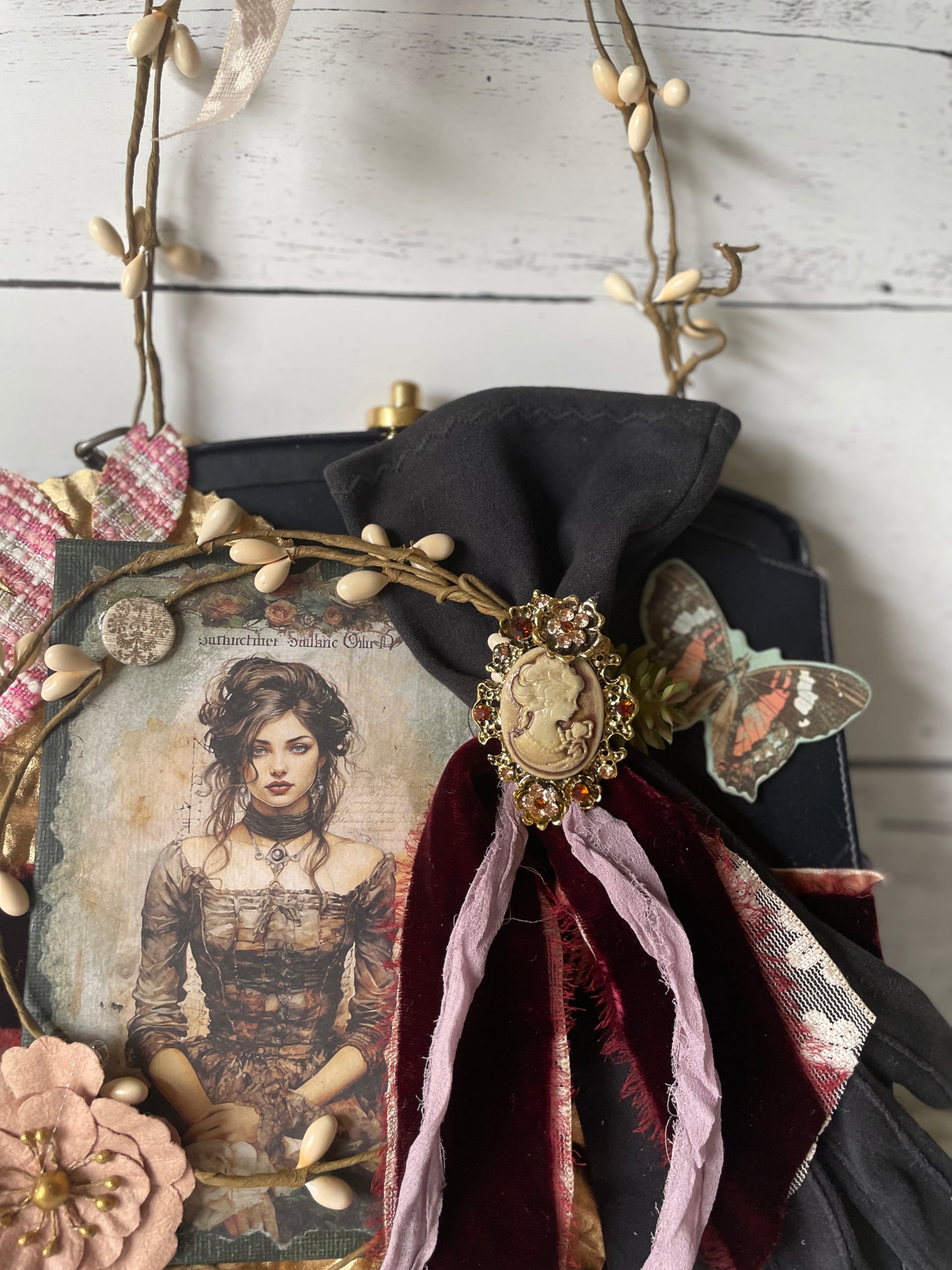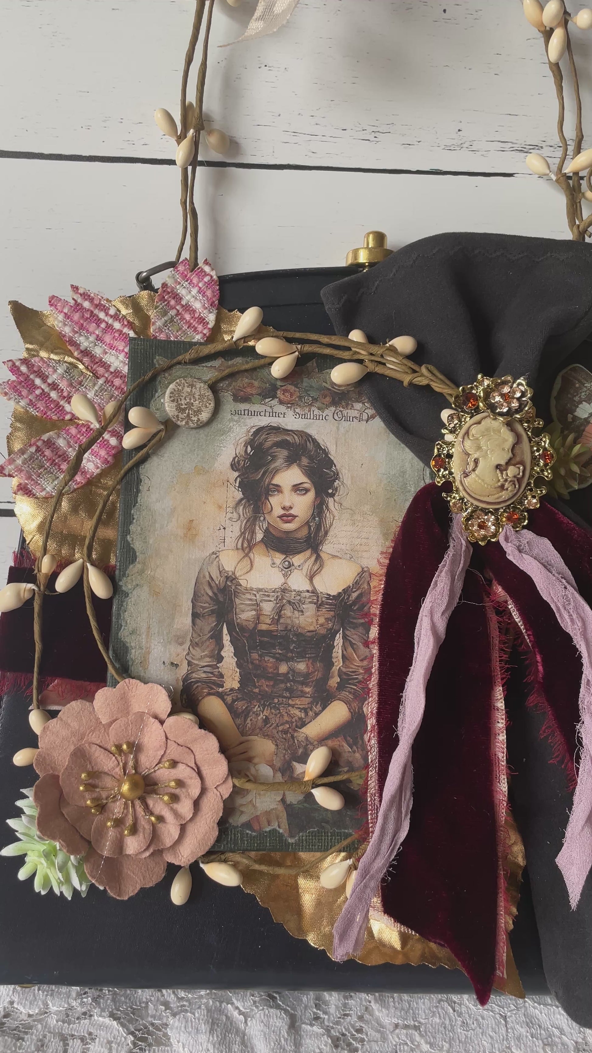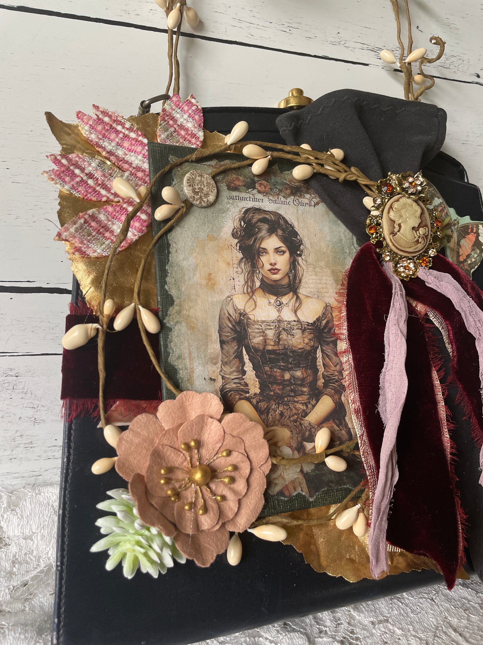 Victorian gothic wall art, made with a vintage black purse , upcycled with decoupage and a cameo pin.The floral elements create a dark and moody ethereal garden look with paper flowers and faux succulents .