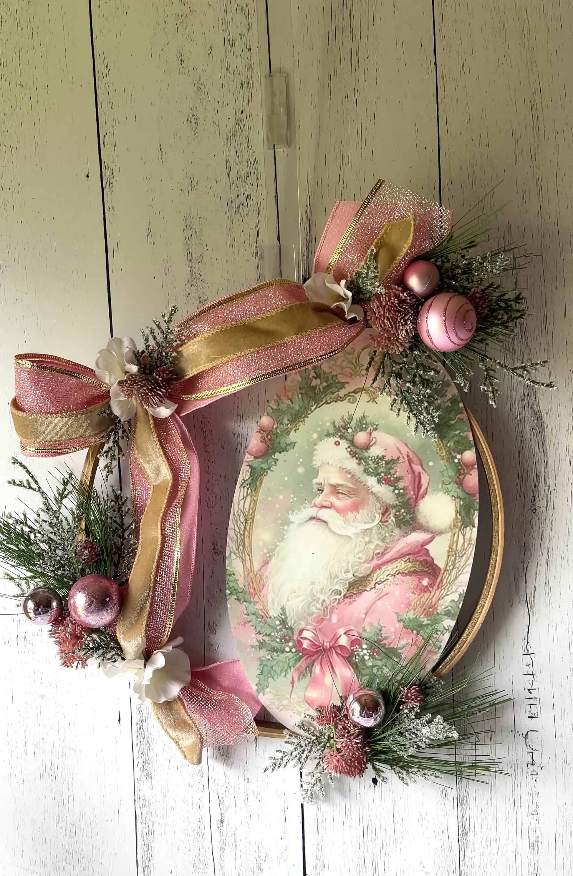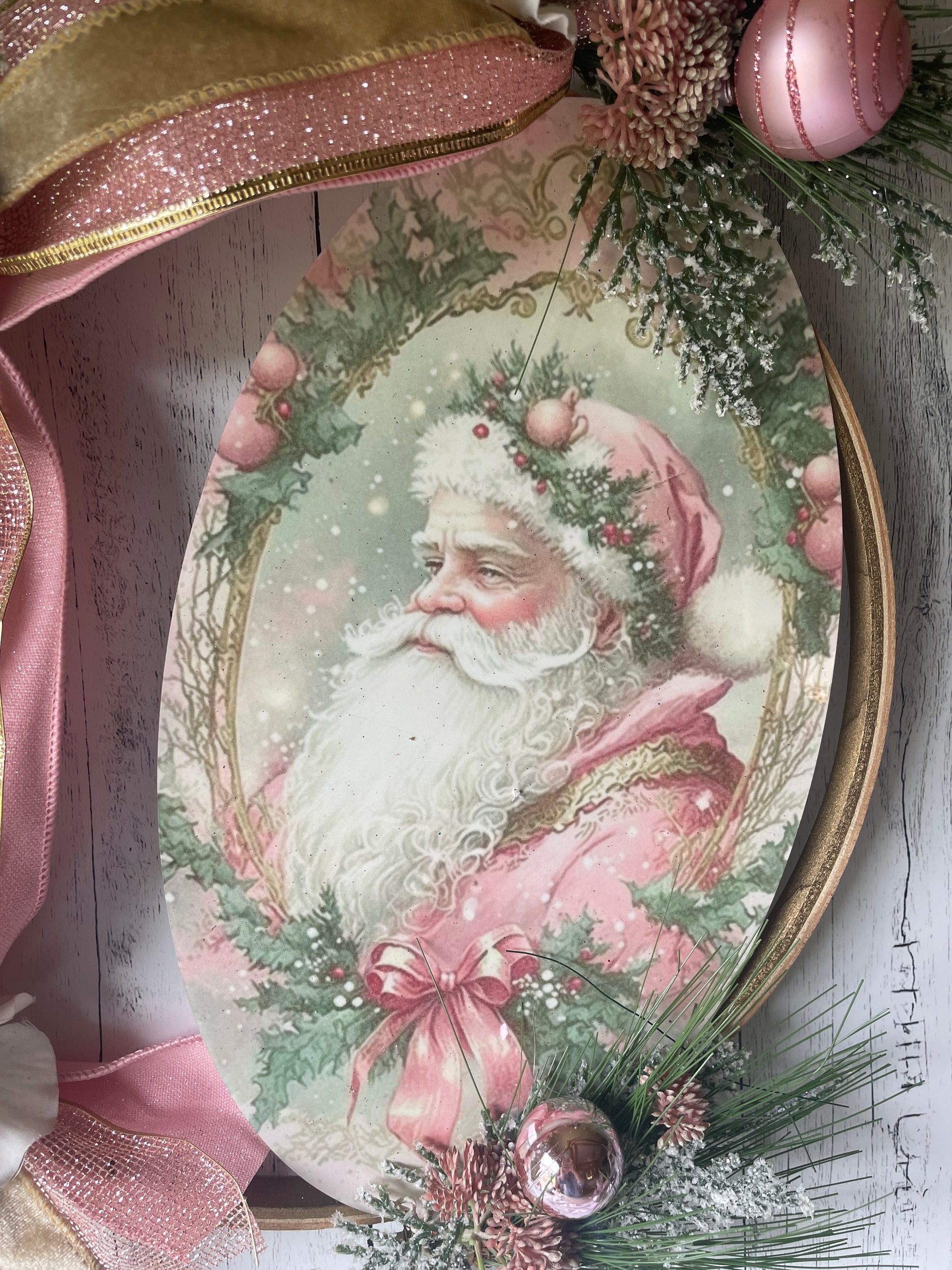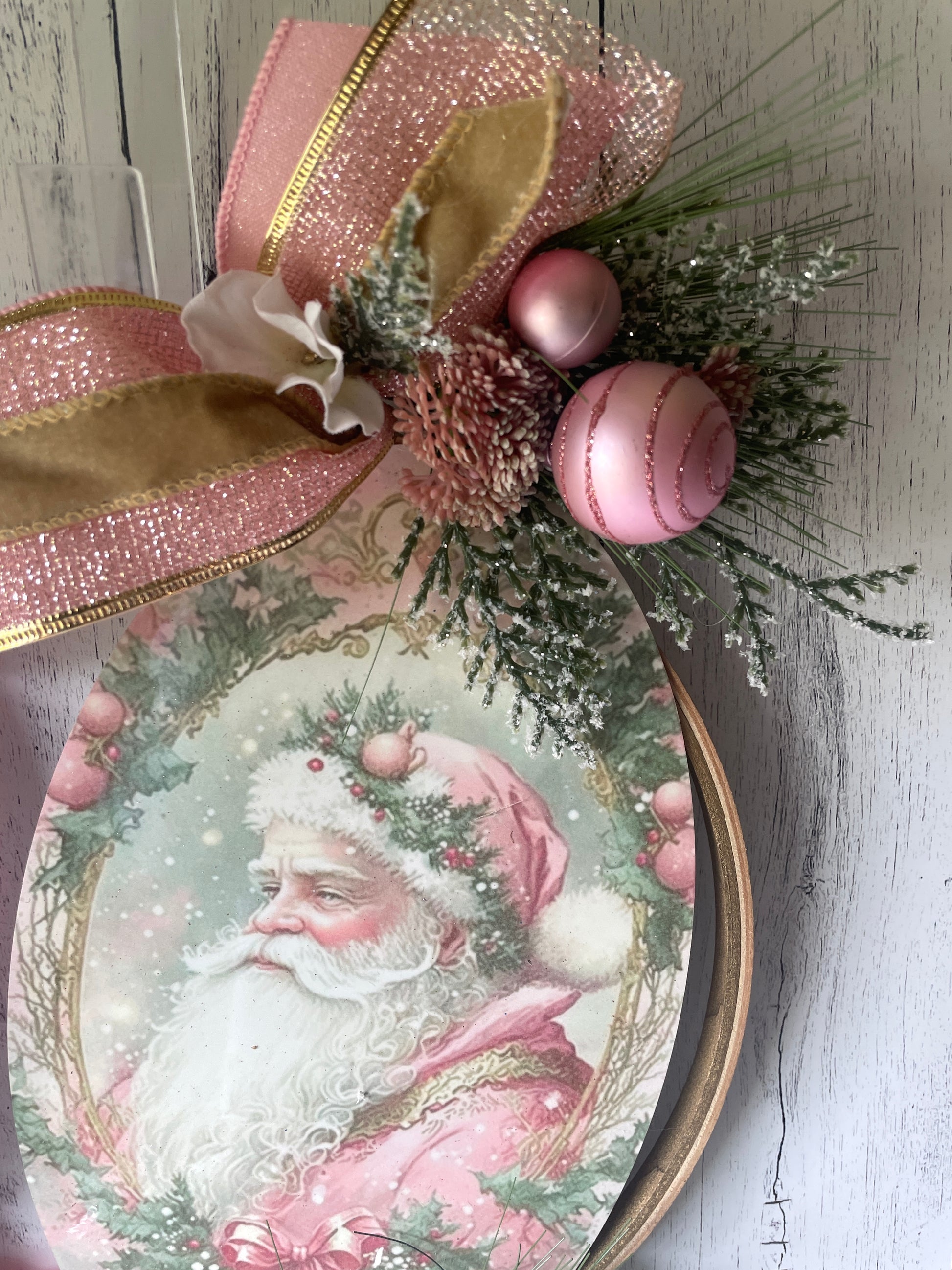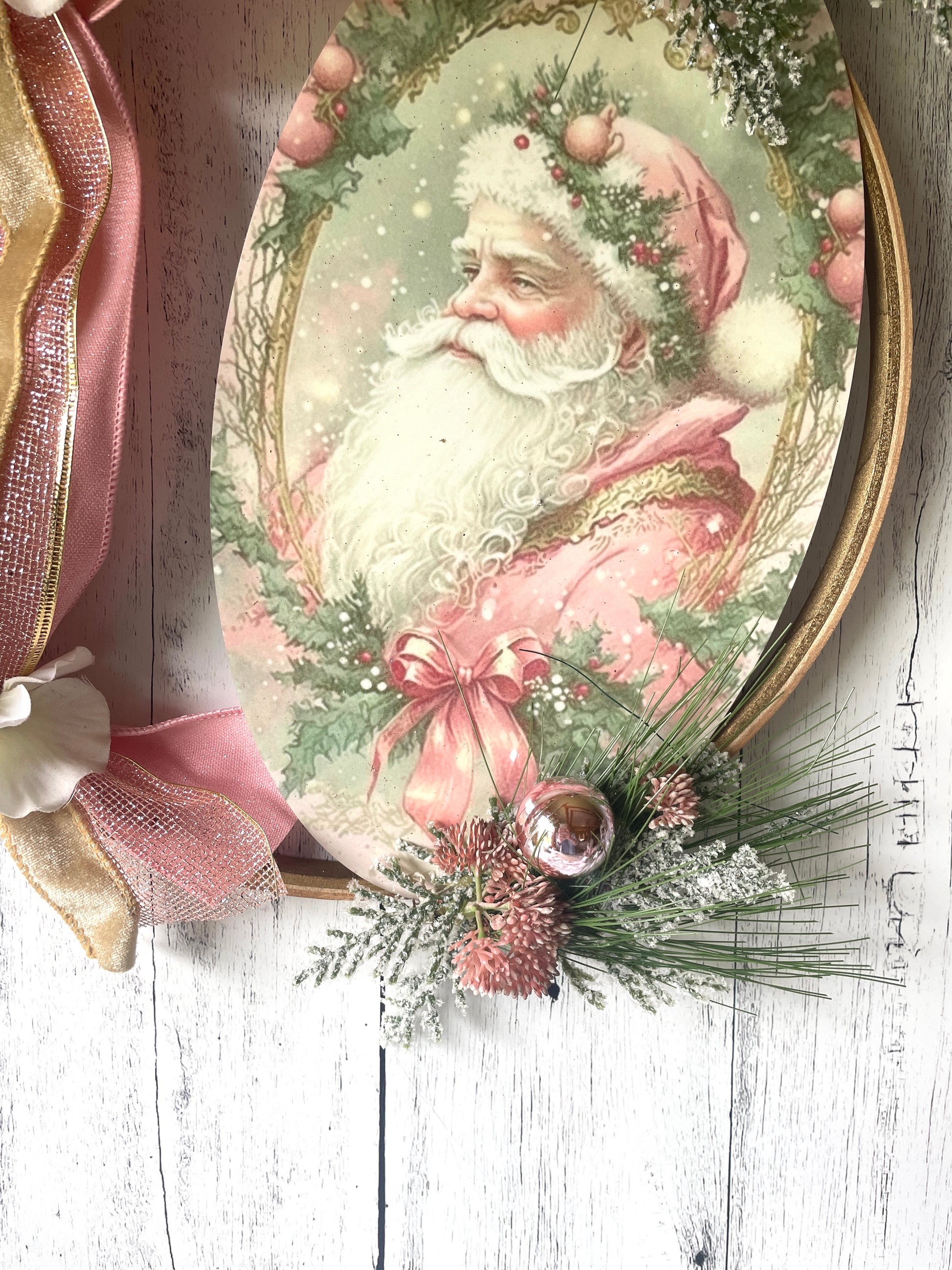 Celebrate the season with timeless elegance and a touch of whimsy. This handcrafted hoop wreath features a vintage-style Victorian Santa portrait dressed in soft blush pink, framed with delicate holiday greenery, snowy accents, and metallic pink ornaments.