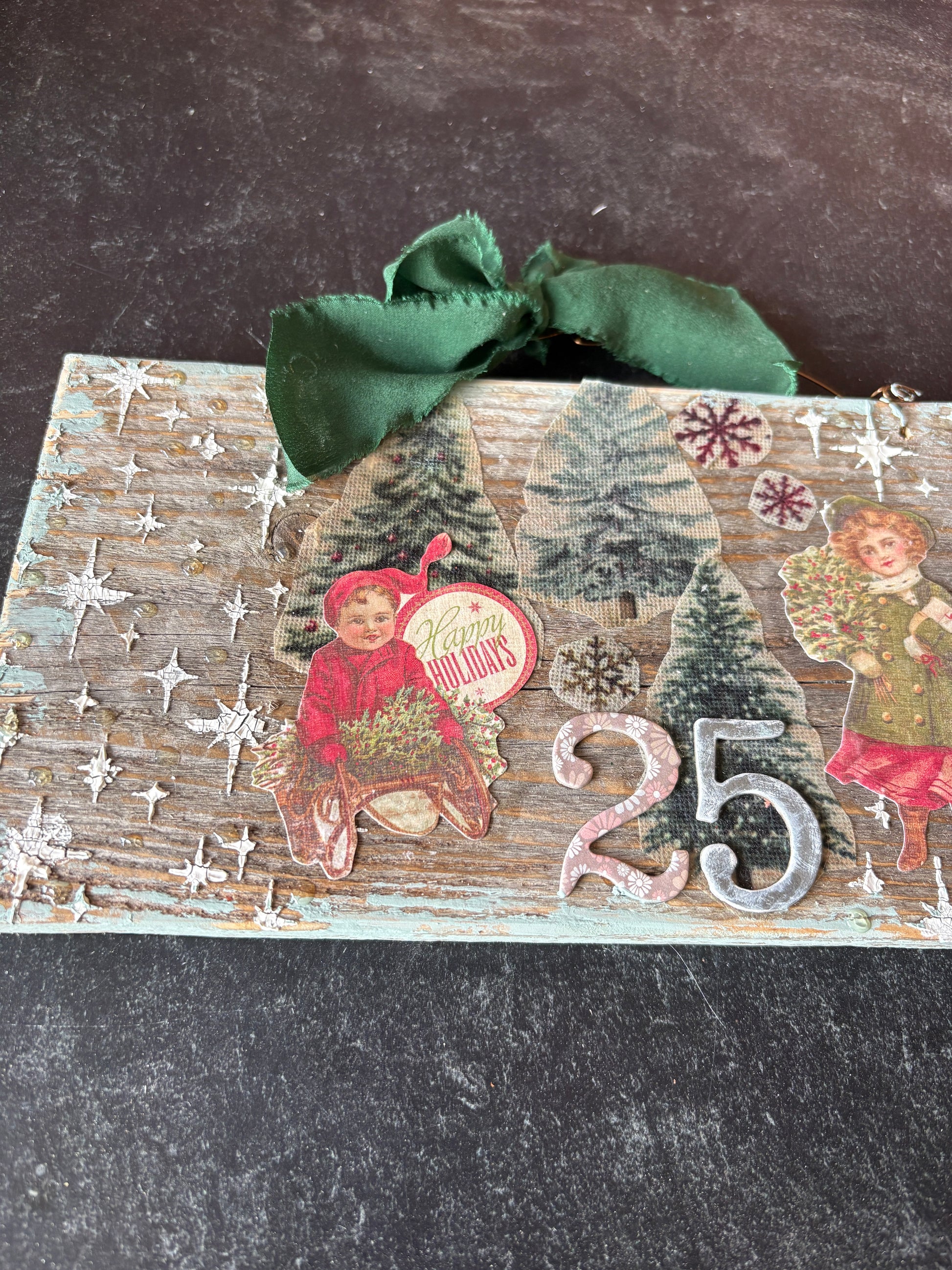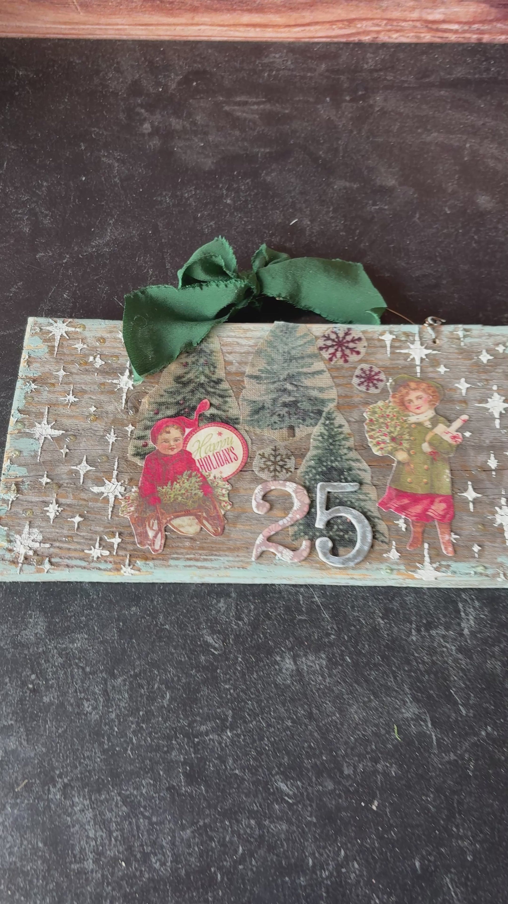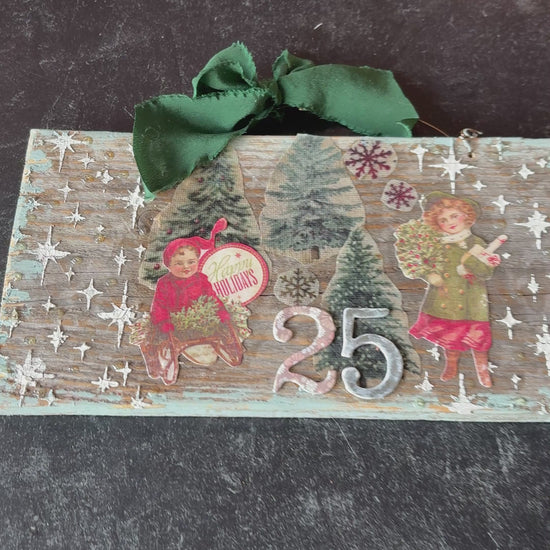 This one-of-a-kind piece features a nostalgic Victorian winter scene of children bundled up in snowy holiday cheer, surrounded by layered textures, vintage-style embellishments, and soft winter hues. Each detail—from the gently distressed wood to the curated mixed-media accents—adds depth, story, and timeless charm to your seasonal décor.