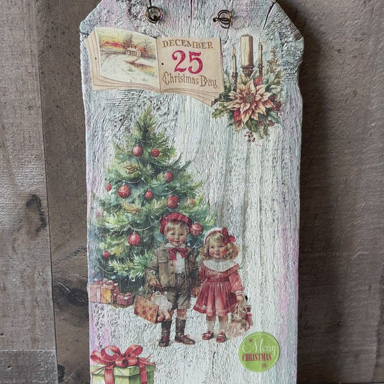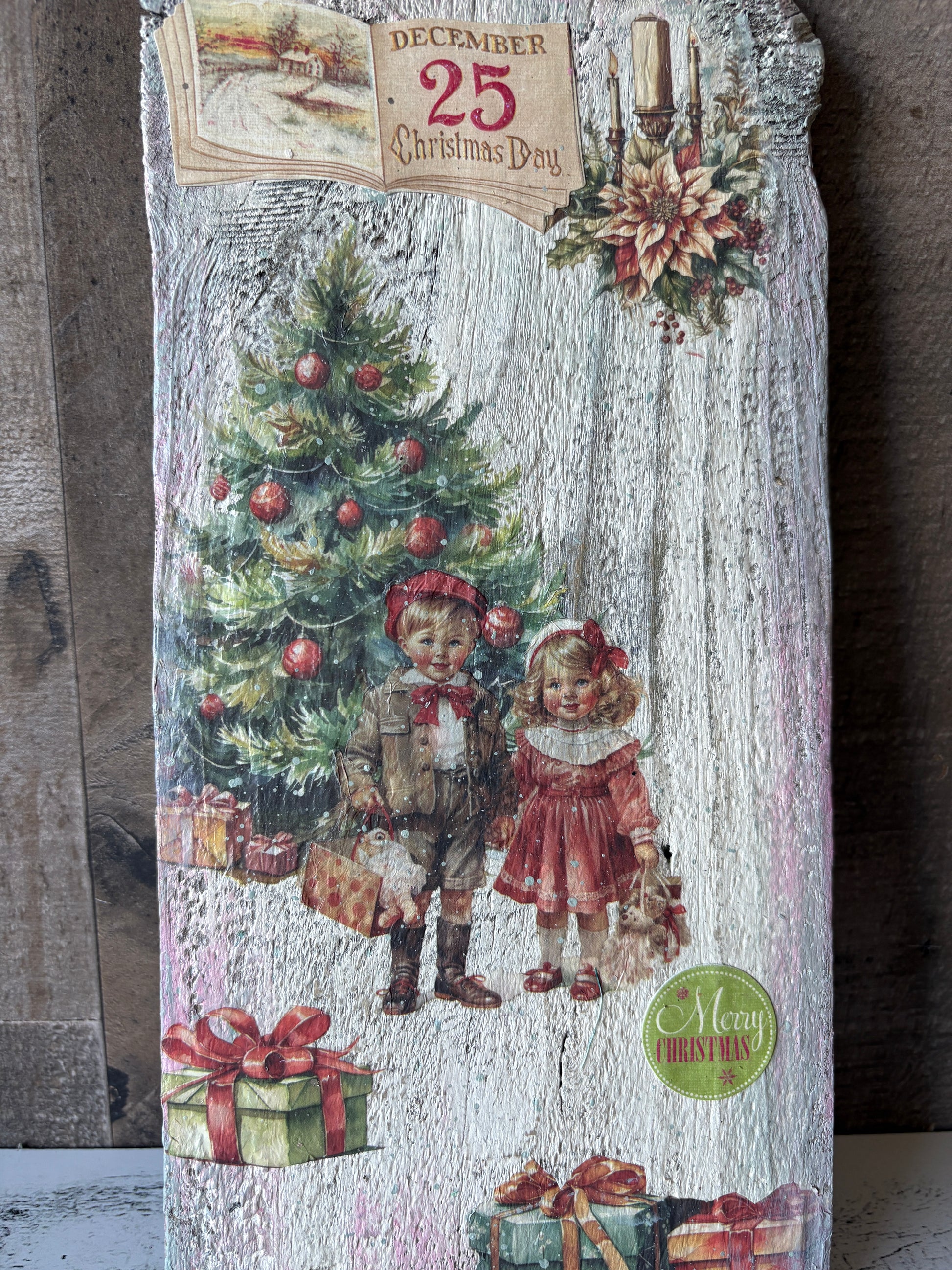 Featuring a heartwarming Christmas scene of children by a twinkling tree, classic poinsettias, and wrapped gifts, this piece captures the magic of old-fashioned holiday traditions. The rustic wood grain and soft aged finish make it perfect for cottage, farmhouse, or vintage-inspired décor.