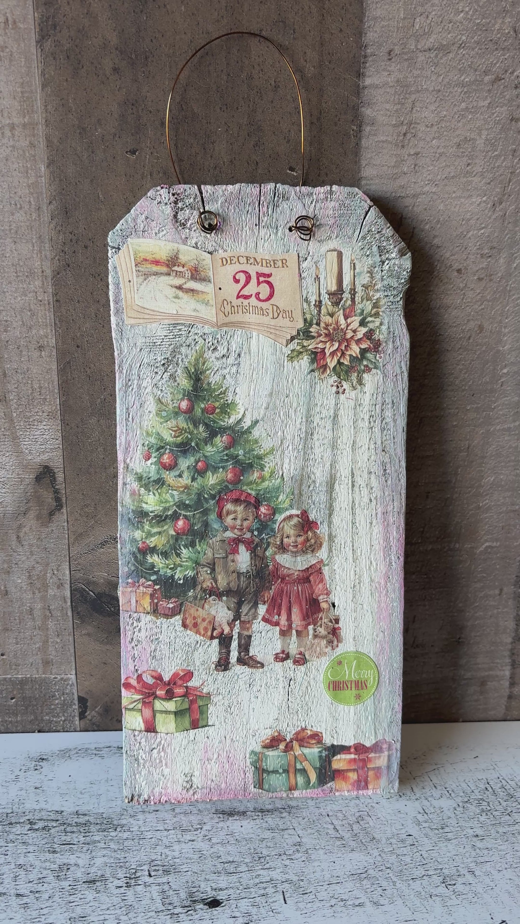 Add a touch of nostalgic Christmas charm to your home with this one-of-a-kind upcycled wood wall art, handcrafted from a reclaimed fence board and beautifully decoupaged with a vintage holiday image.
