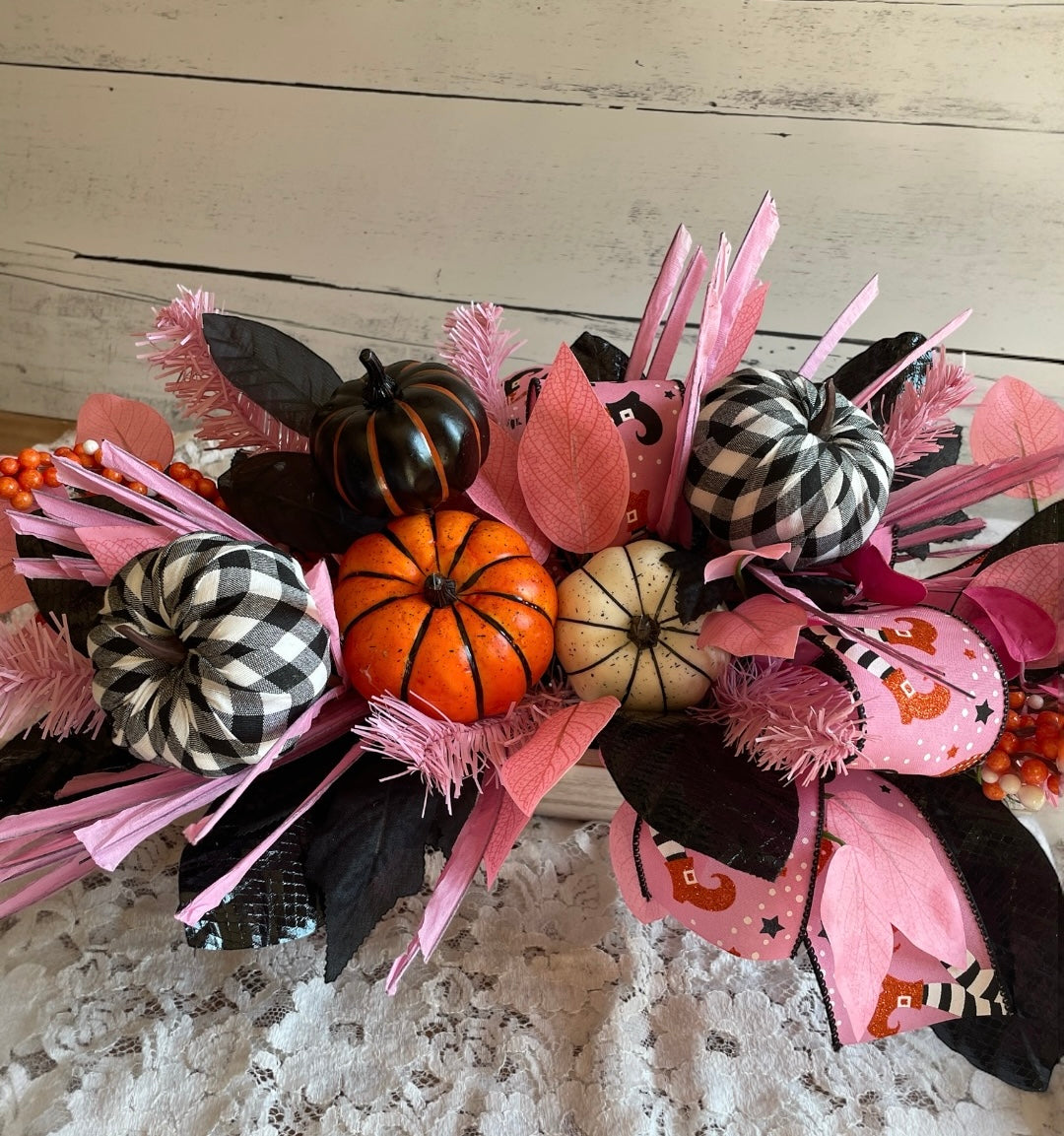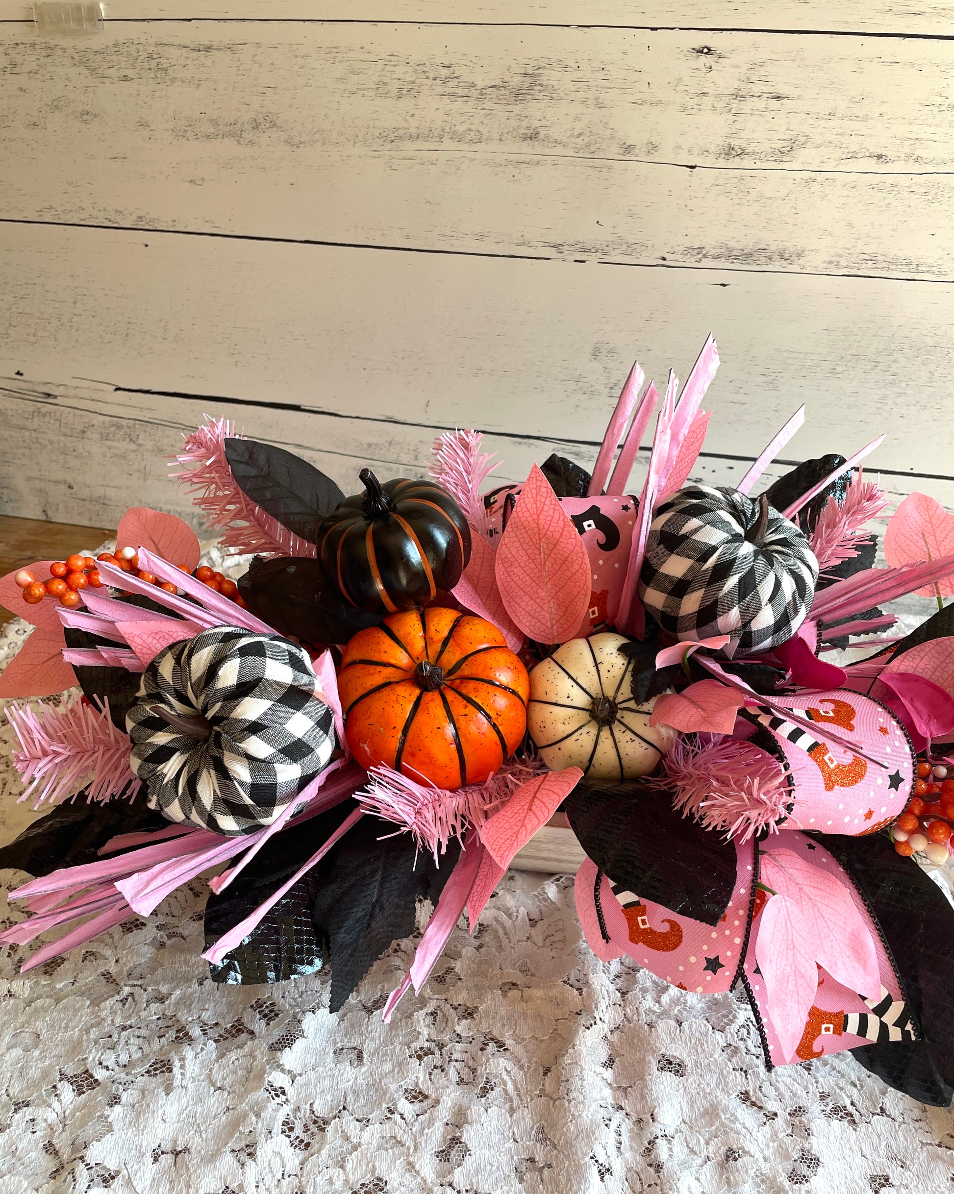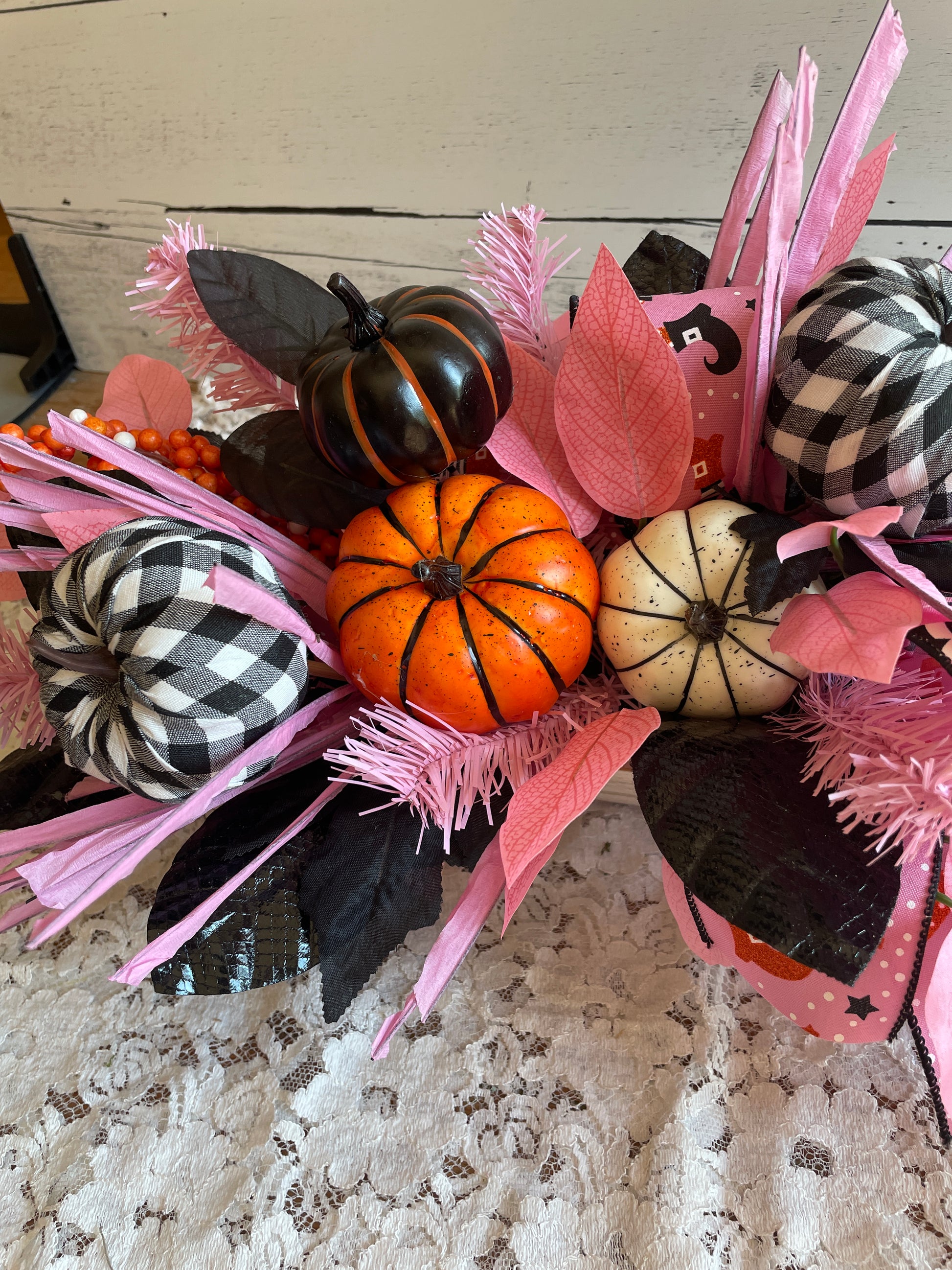 Make your Halloween decor pop with unexpected charm and playful flair! This one-of-a-kind centerpiece blends classic fall elements with a twist of whimsical magic—featuring black-and-white checkered pumpkins, vibrant orange and cream gourds, pink painted foliage, and a bold ribbon adorned with the most delightful witchy legs!
