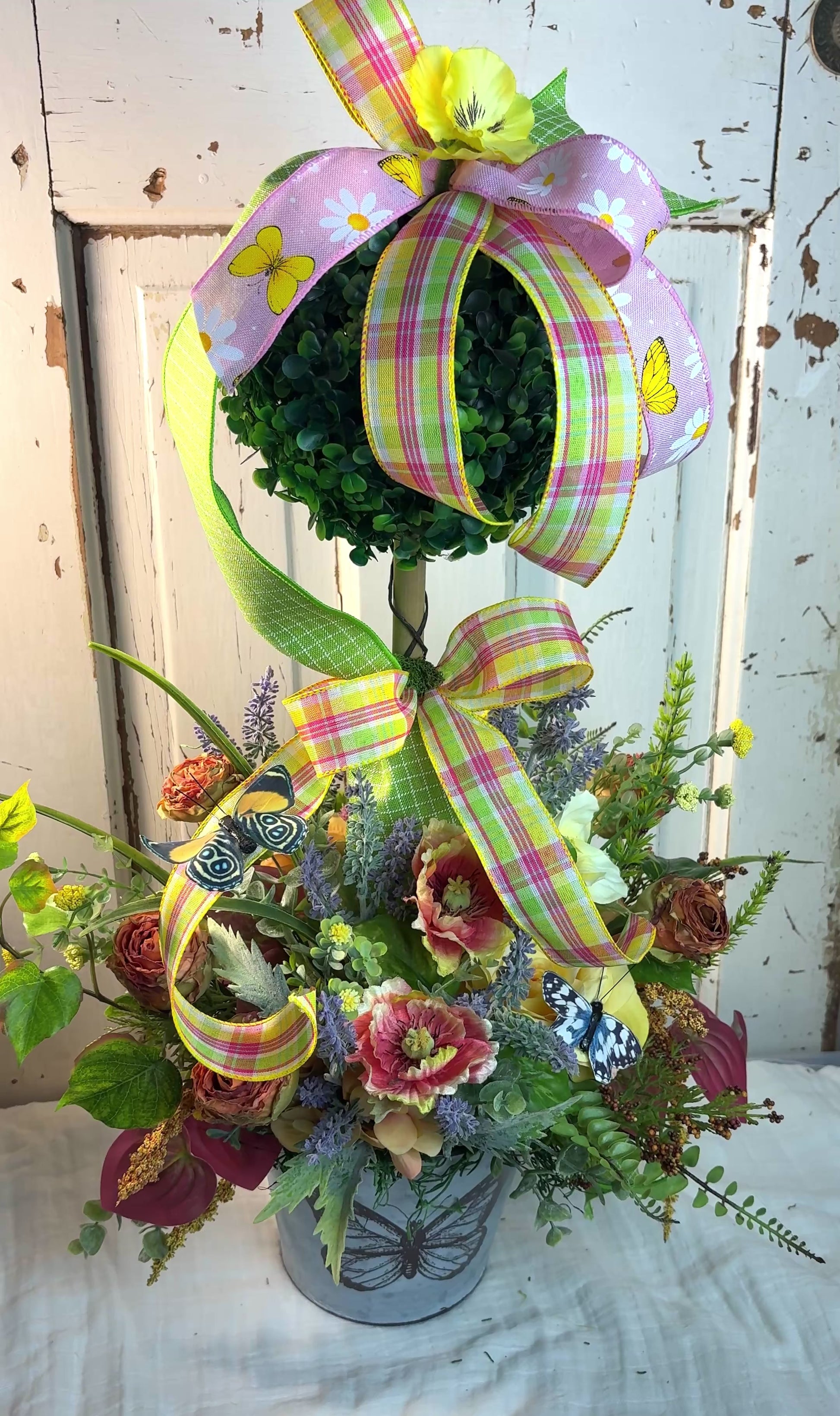 Whimsical Spring Floral Topiary with Butterflies & Ribbon | Garden-Inspired Home Decor