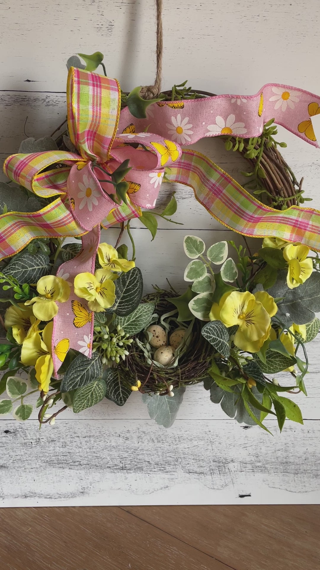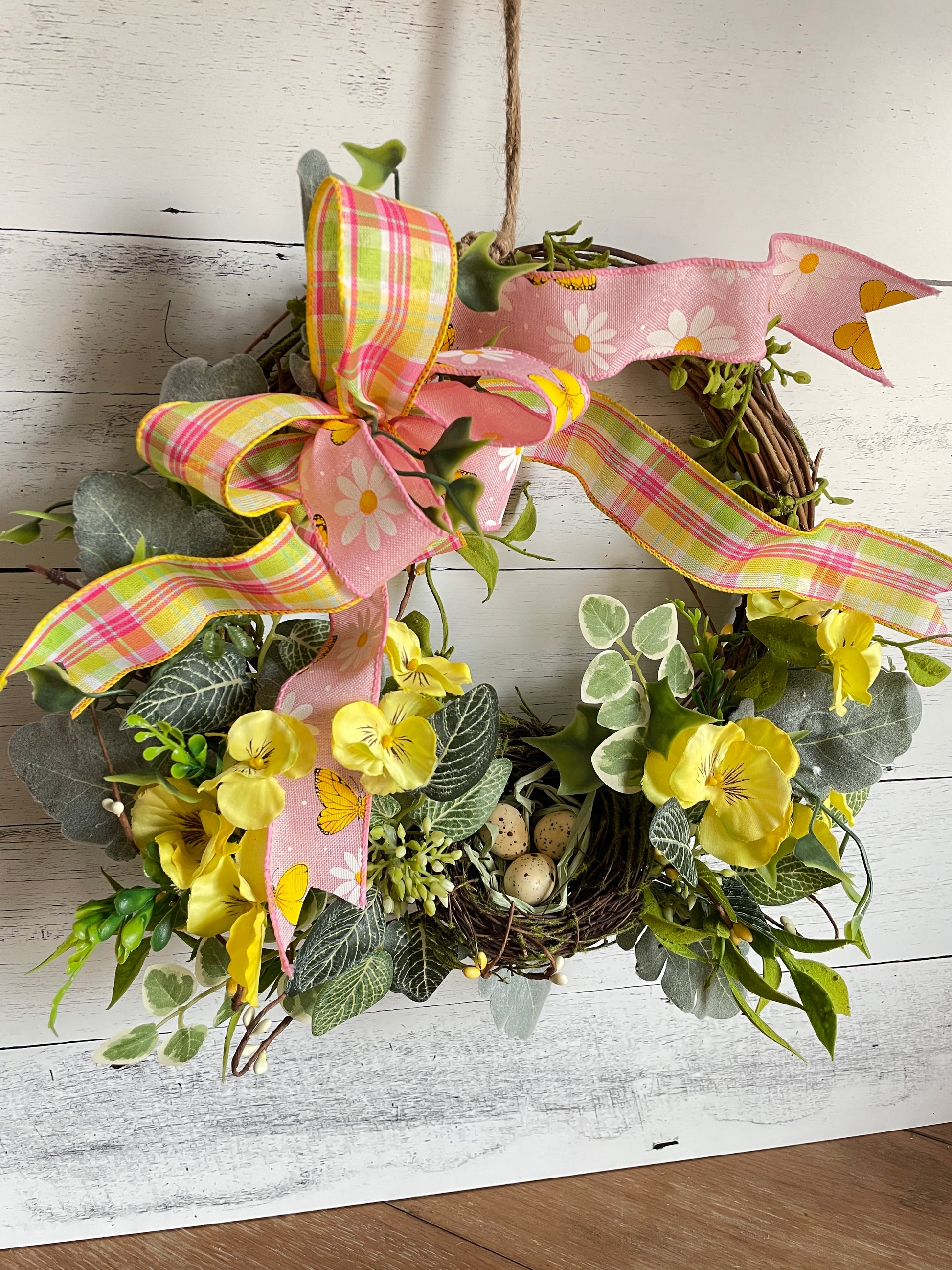 The base of this wreath is grapevine with bright yellow pansies and faux greenery. A little birds nest of eggs is the focal point.